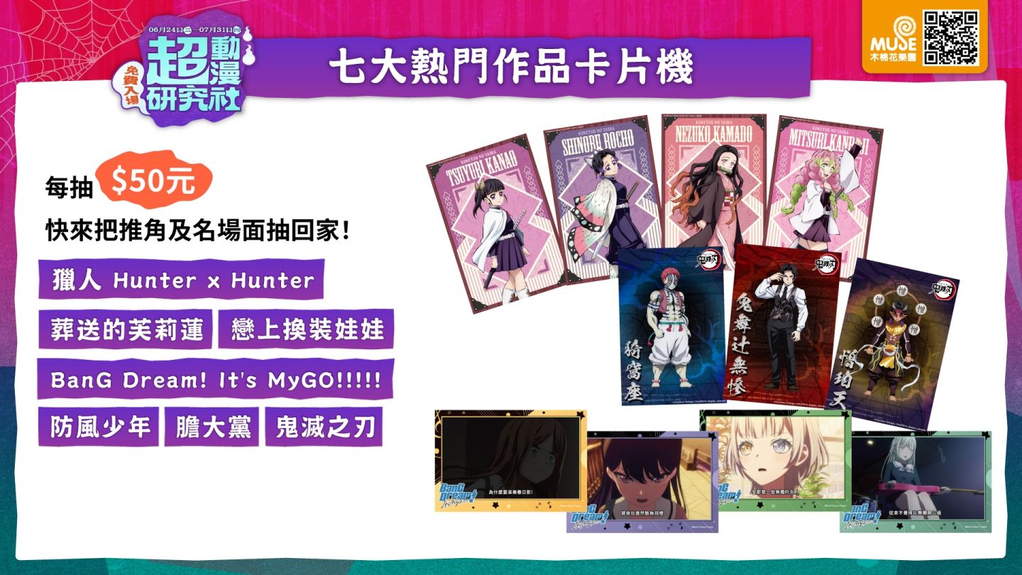 活動現場共設置八台抽卡機,包含七種熱門動漫主題:《獵人 Hunter×Hunter》、《鬼滅之刃》、《膽大黨》、《葬送的芙莉蓮》、《戀上換裝娃娃》、《BanG Dream!It's MyGO!!!!!》、《WIND BREAKER—防風少年—》。