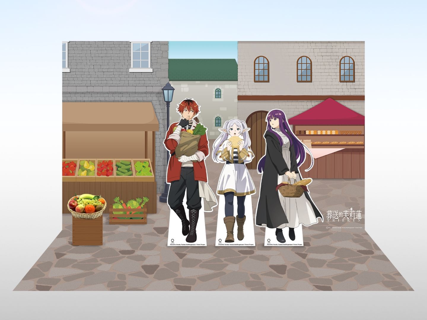 活動展區的兩側門口設有兩大作品合影區:討論度超高的《葬送的芙莉蓮》合影區重現了市區街景,現場備有互動水果籃道具可供拍照使用,快來體驗與芙莉蓮一行人逛街的感覺吧!