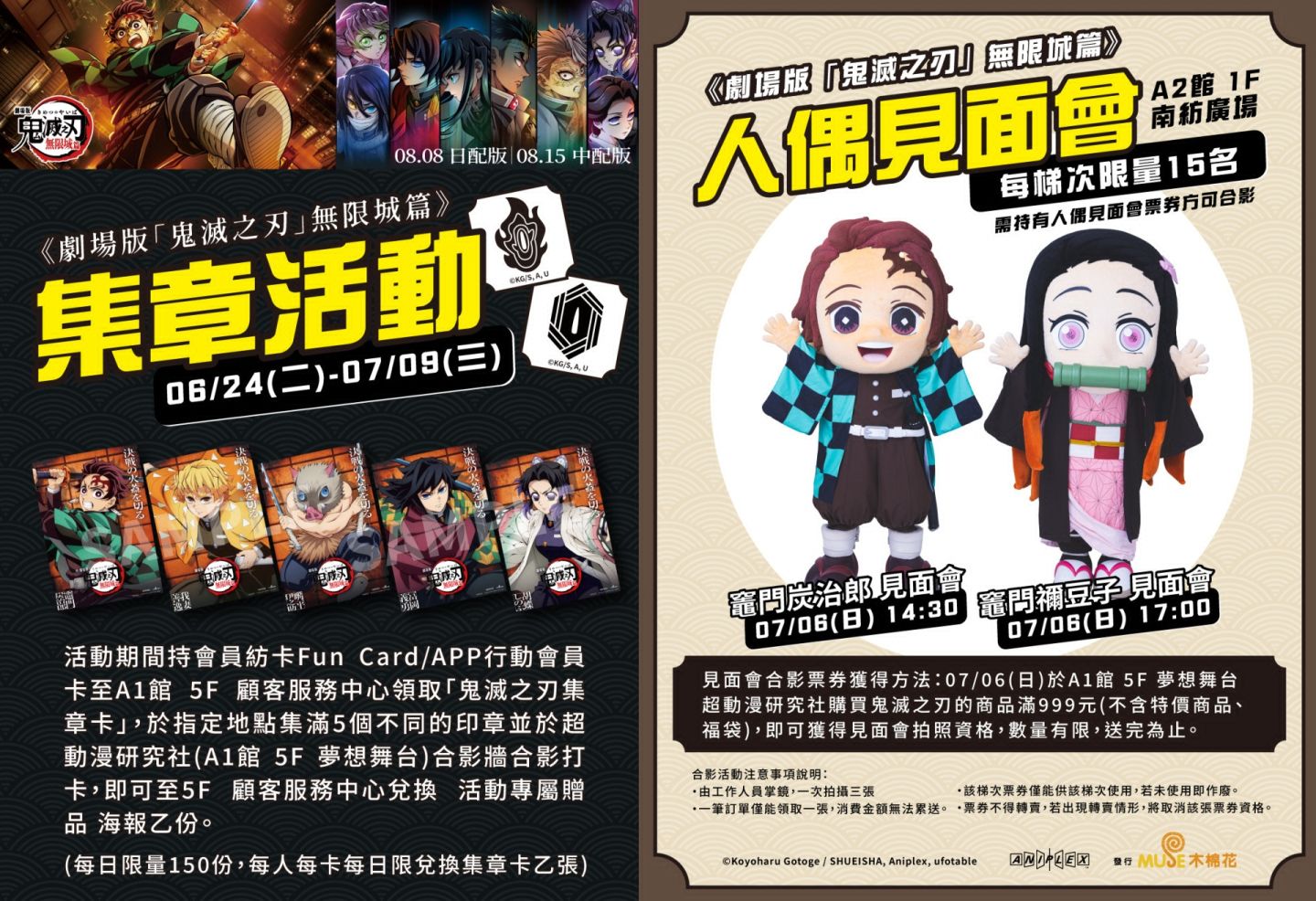 於 6 月 24 日至 7 月 9 日期間,館內五個地點蓋章並完成南紡購物中心內的集章任務,即可至 5 樓顧客服務中心兌換活動專屬 A3 電影限定海報乙張!海報每日數量有限,贈完為止。炭治郎、禰豆子人偶見面會將於 7 月 6 日舉辦,於 7 月 6 日當天購買《鬼滅之刃》商品滿 999 元,即可獲得任一梯次合影資格。每梯次限量 15 名。共兩梯次,贈完為止。