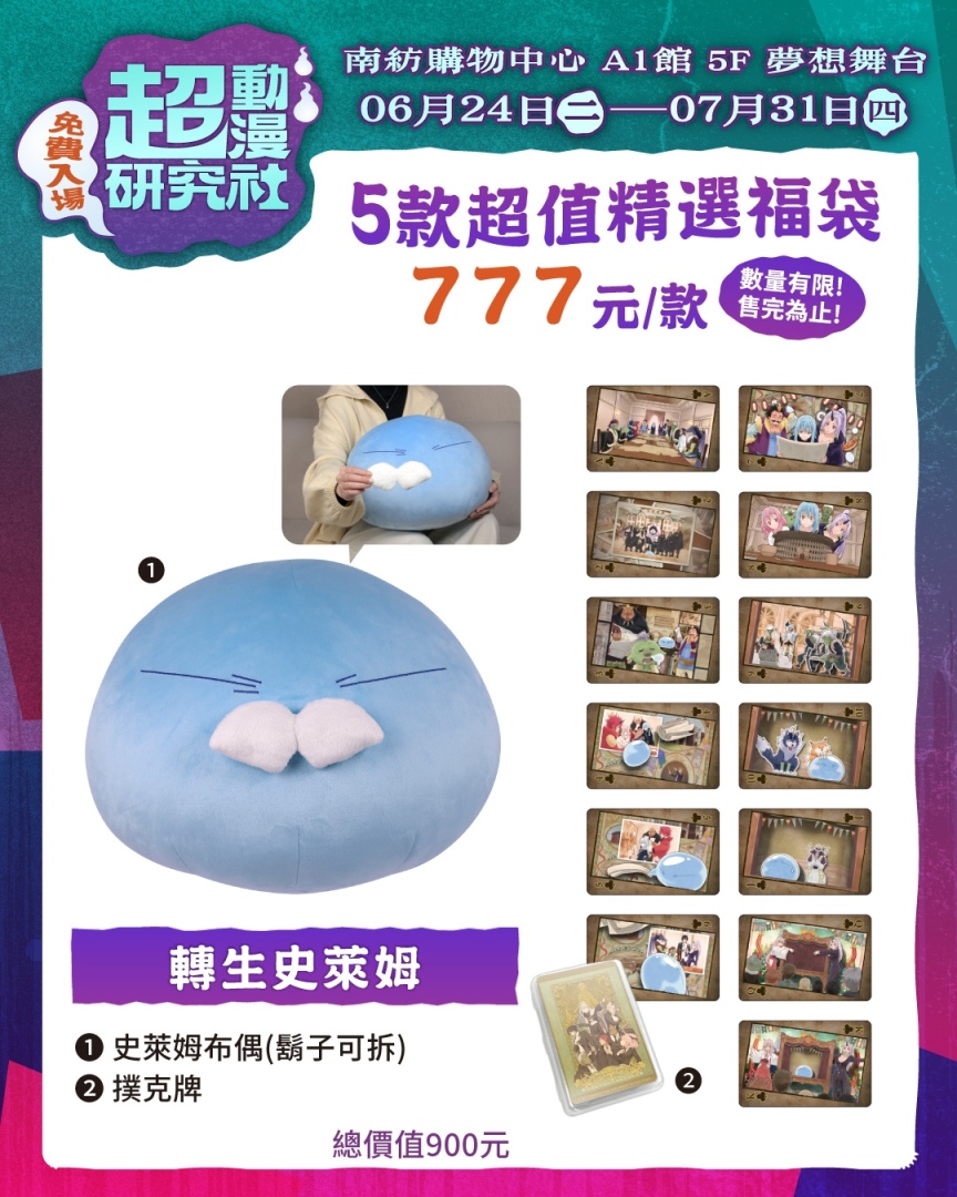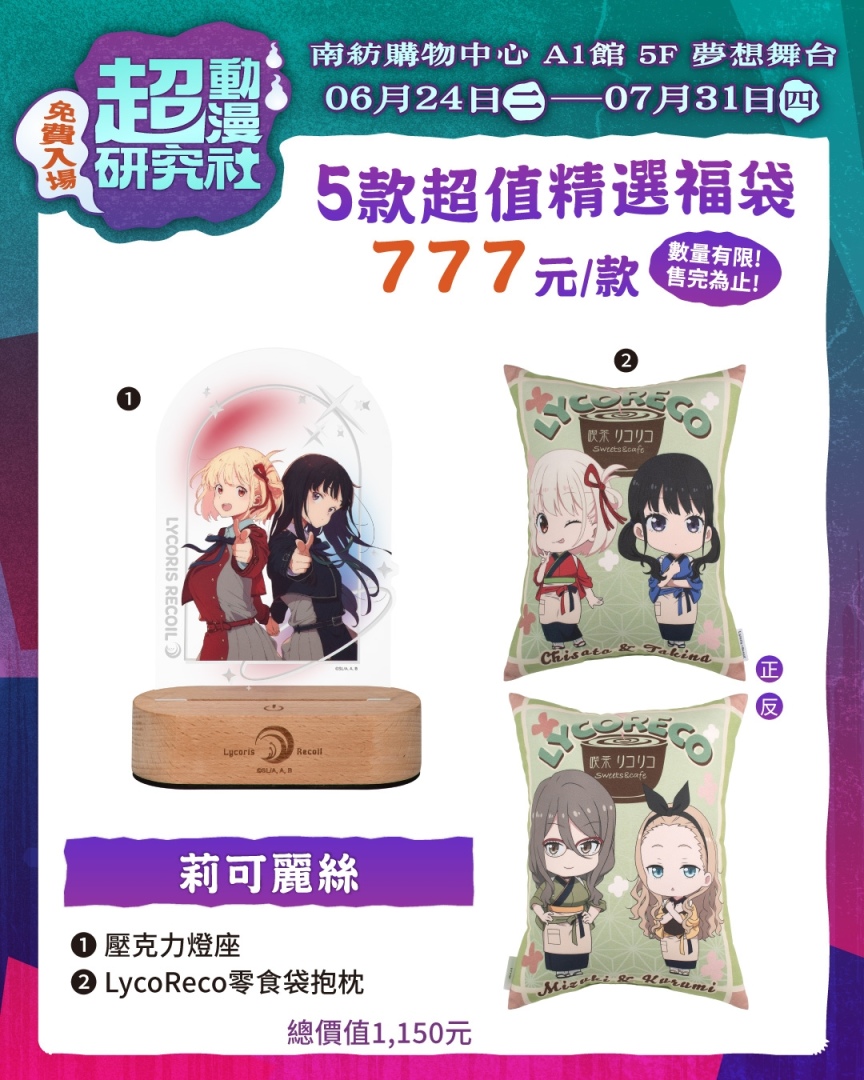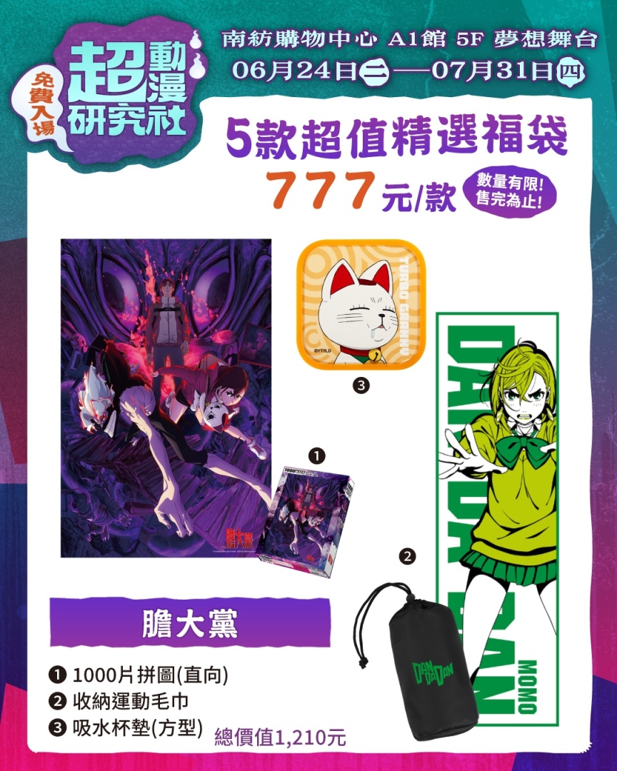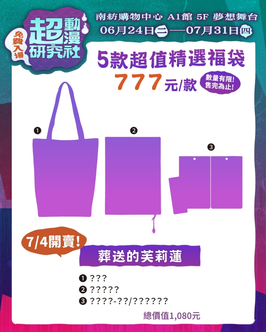 五款熱門動漫 IP 超值福袋,將於超動漫研究社活動現場、木棉花樂園及台北門市同步開賣,數量有限,售完為止。