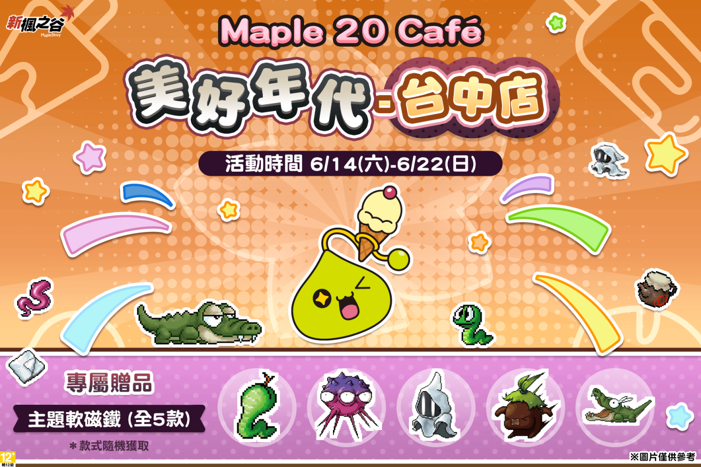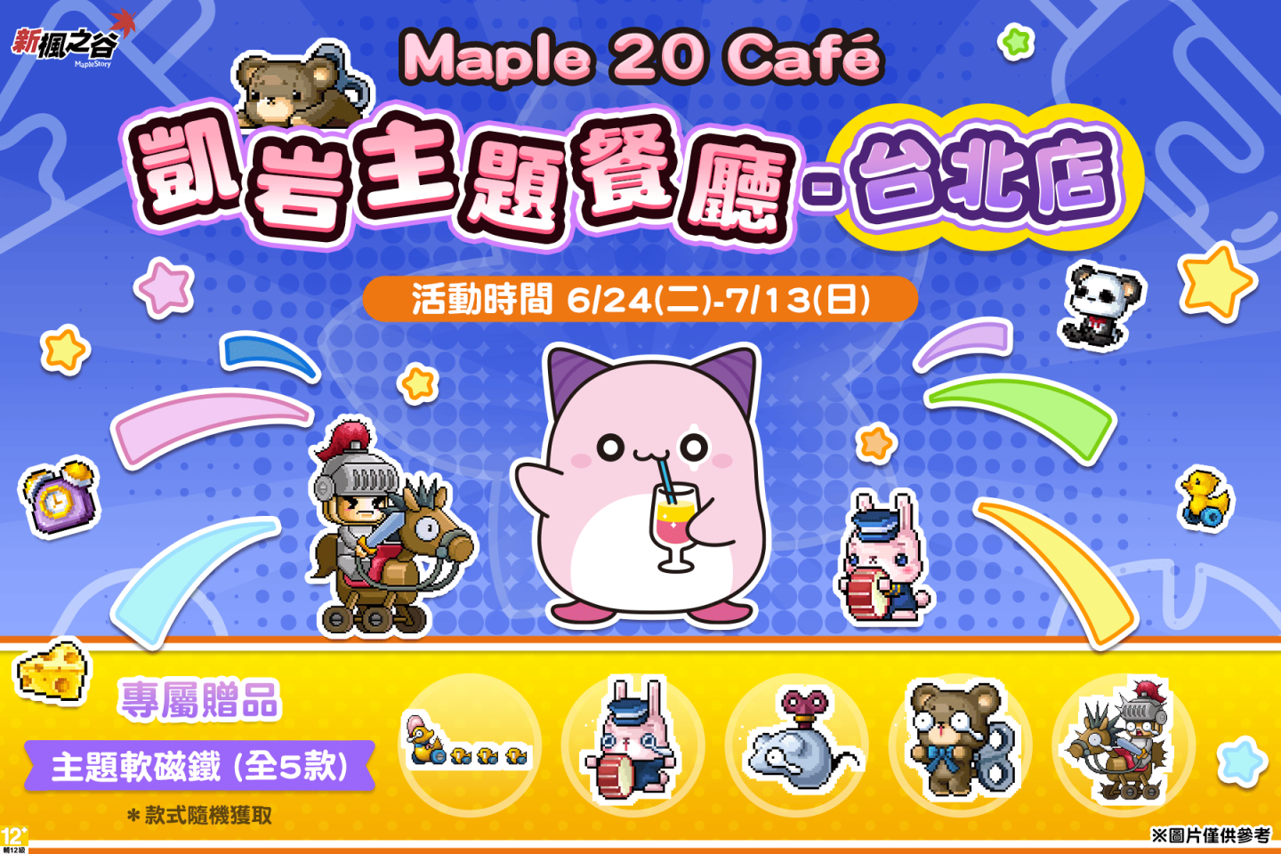 歡慶《新楓之谷》20 週年,官方特別規劃三地應援咖啡廳,分別於台北「凱岩主題餐廳」、台中「美好年代」、高雄「魯克思咖啡」打造期間限定主題空間。三間店鋪皆以遊戲經典場景為設計靈感,營造出滿滿回憶感的沉浸式氛圍,現場更準備豐富驚喜等玩家到場探索!