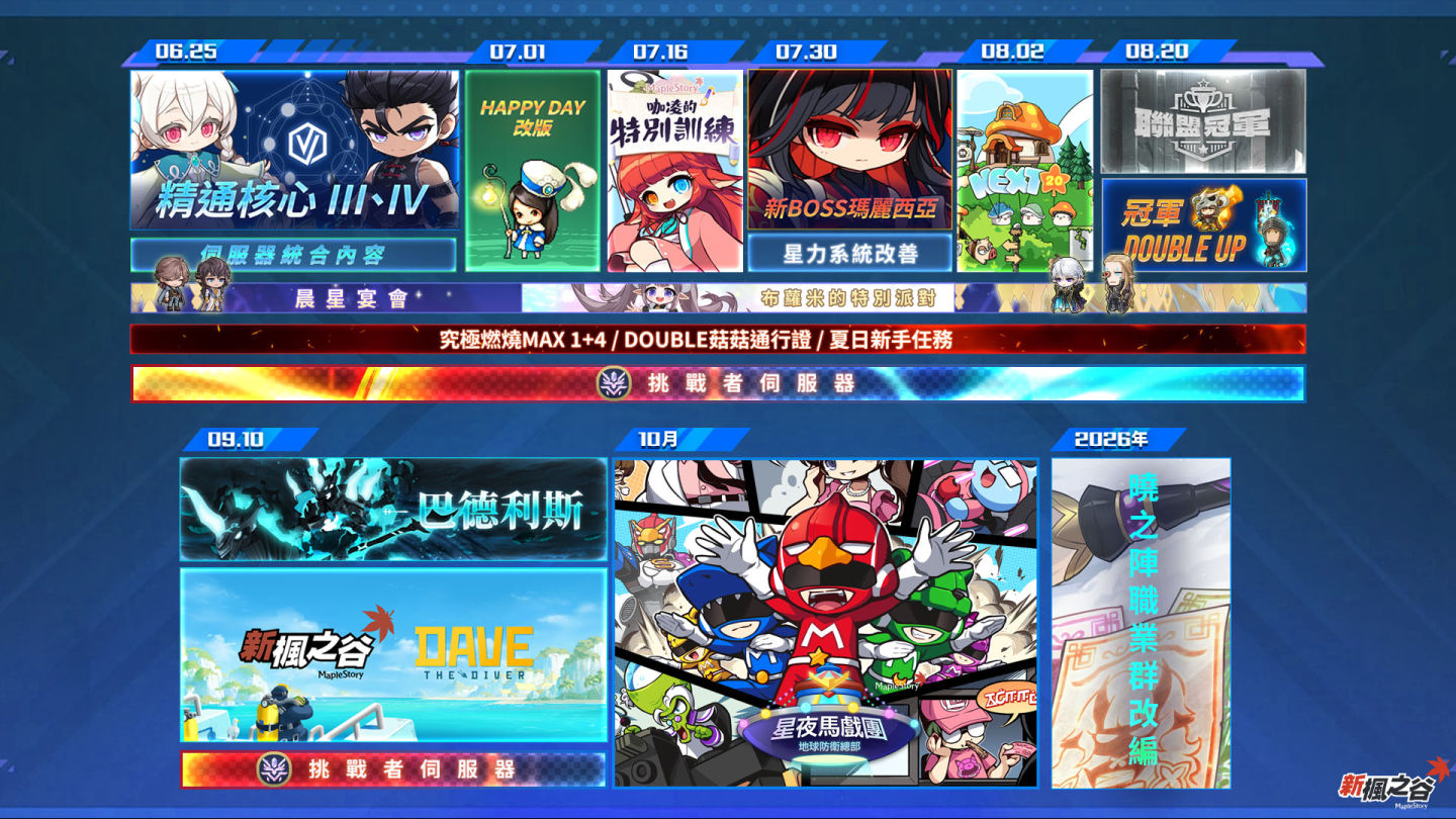 為歡慶《新楓之谷》邁入 20 週年,官方更規劃一系列線上線下活動,帶來超乎想像的豐富內容與沉浸體驗!除了遊戲內的精彩活動與獎勵,本次改版的最大亮點為首次推出獨家特化伺服器「挑戰者伺服器」,並同步開放兩種六轉精通核心,將帶給玩家升等與戰力突破的雙重快感!快揪上好友,一起預約參加,迎接這場熱血不止的夏日挑戰!
