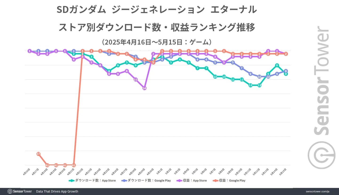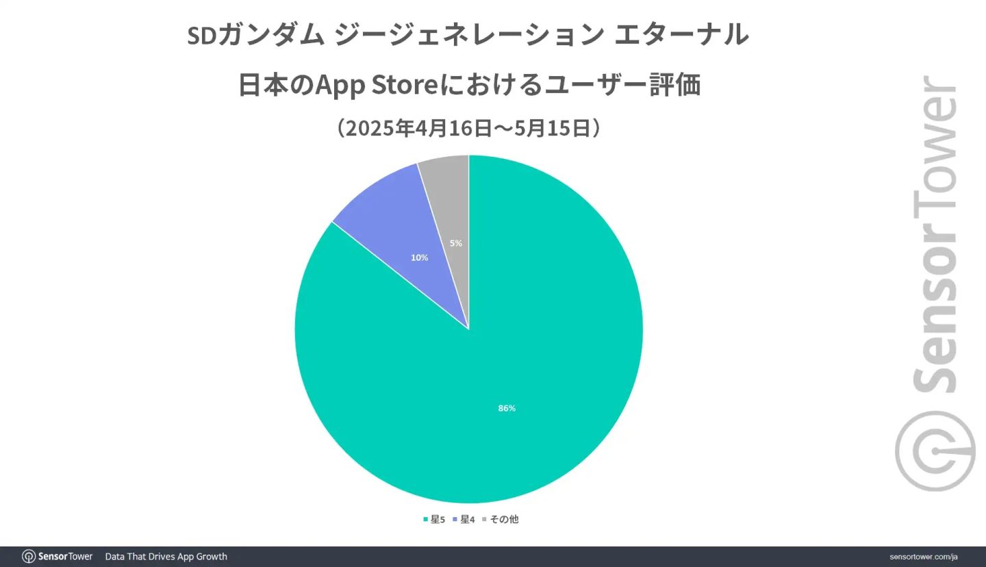 根據 Sensor Tower 公開的數據指出,《SD鋼彈 G世代 永恆》自發售日 2025 年 54 月 16 日起至 5 月 15 日為止,就高居兩大平台下載排行榜的榜首,並分別獲得雙平台 85% 5 星(加 4 星在內則是 95%以上)好評(不光只是《鋼彈》IP 支持加成,在手機回合制 RPG 中也獲得極高評價)。