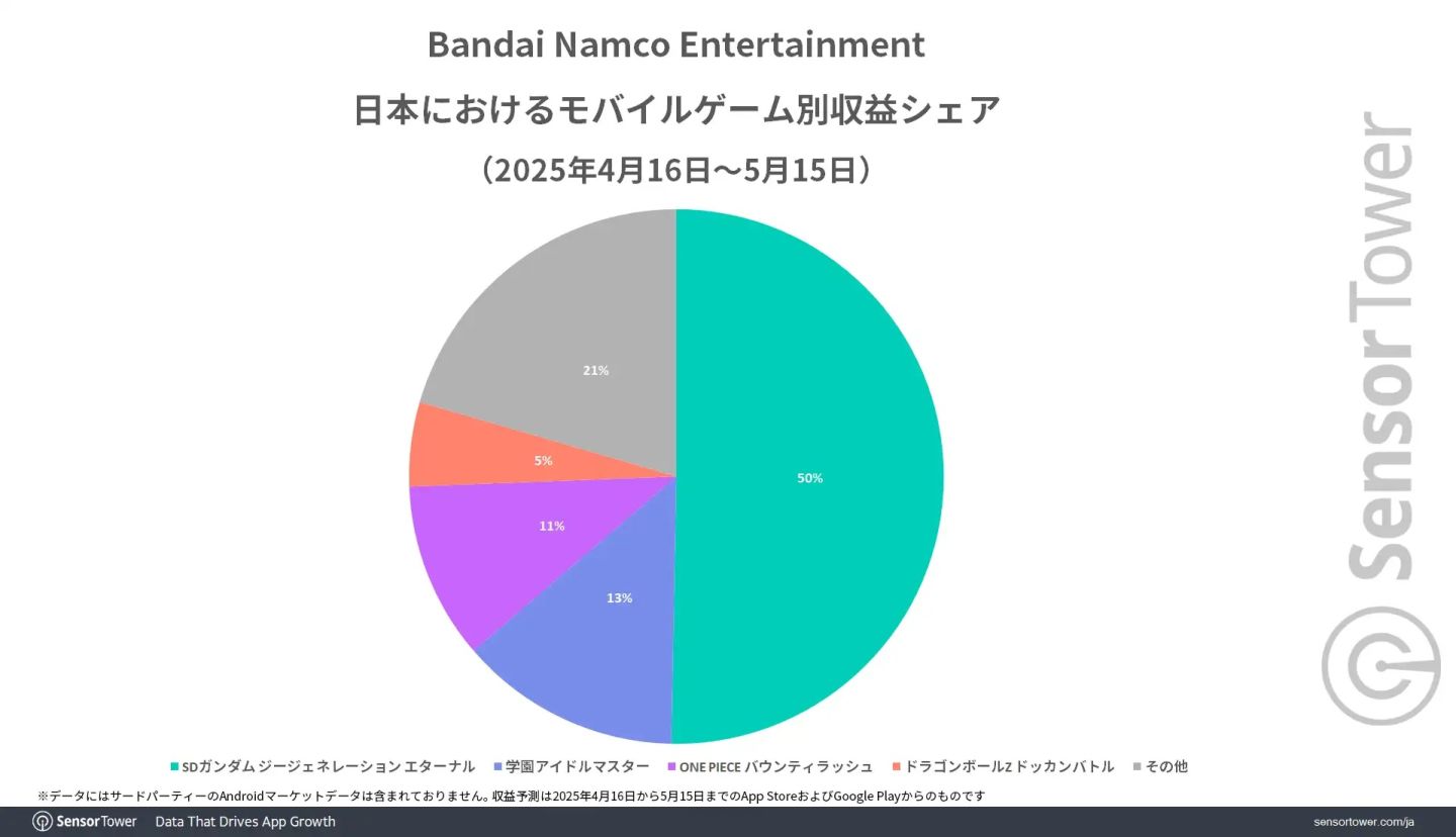 而在收益方面,同樣根據 Sensor Tower 的資料指出,本作於 2025 年 4 月 16 日至 5 月 15 日期間,在日本 Bandai Namco Entertainment 的手機遊戲類別收益中,就高佔整體 50%收益,可見遊戲人氣之旺。