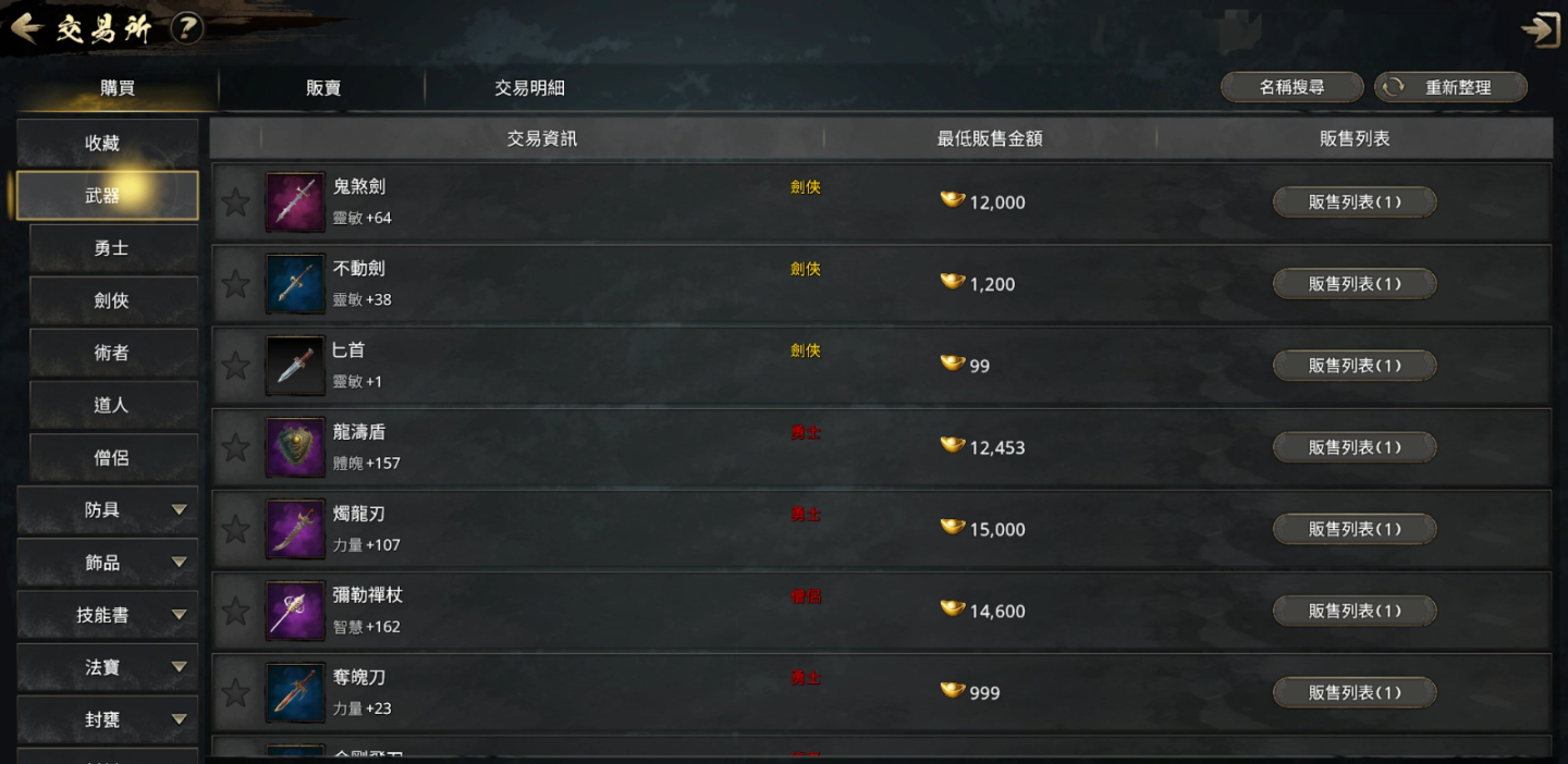 遊戲中的「交易所」也提供另一種裝備取得方式!玩家可直接購買交易所中從其他玩家販售的裝備或道具,不論是大成功煉製出的非綁定裝備,或是洗出稀有屬性的強力兵器,都可能出現在交易市場中。你也可以將想追蹤的裝備加入收藏清單,以隨時掌握行情。