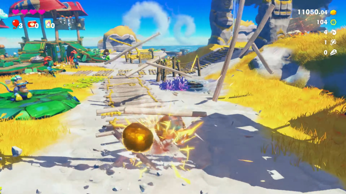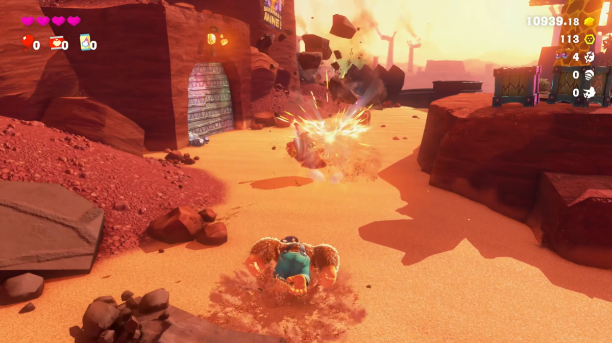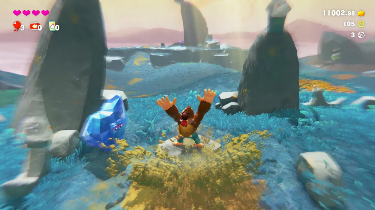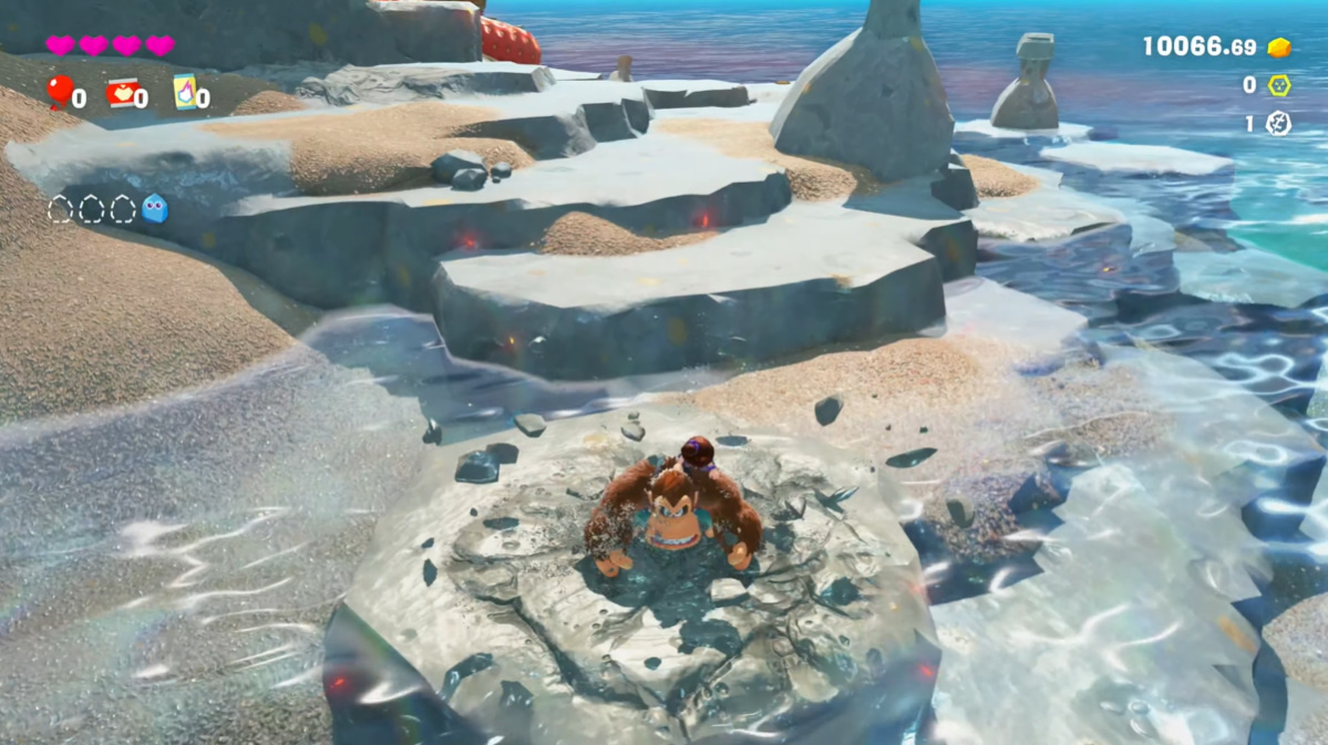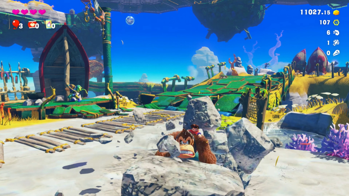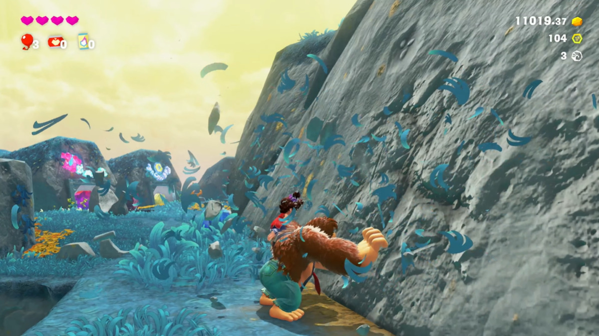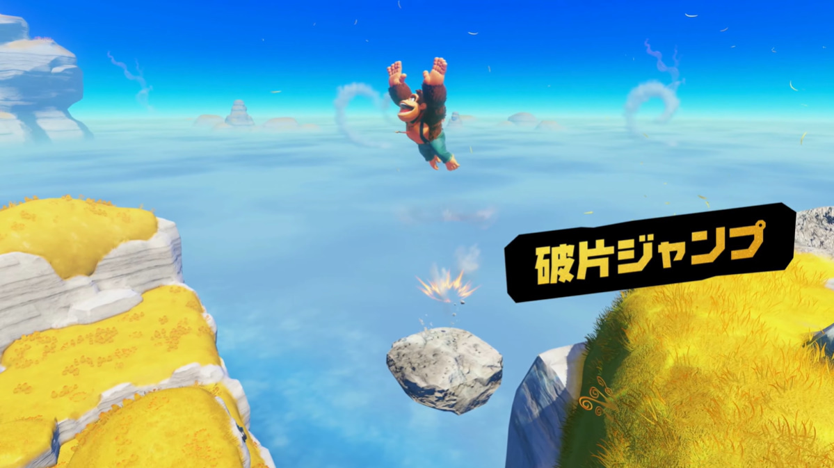 除了利用拳頭將岩石、地面等阻礙全部打掉開創前路外,玩家還可以利用更加強大的下墜拳來敲擊挖掘地面,藉此不斷往地底前進。除此之外,也能透過抓住地面碎片來做為武器迴轉攻擊,或是拿岩石地面碎片當作滑板快速移動(也可以拿來在水面上當作水上滑板移動),或是投擲出去,或是利用這些岩石地面碎片進行二次跳躍;透過咚奇剛強大的拳頭威力,讓玩家可以自由前進,探索這片美麗廣闊的 3D 世界。