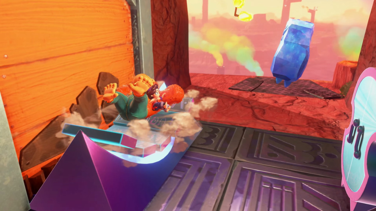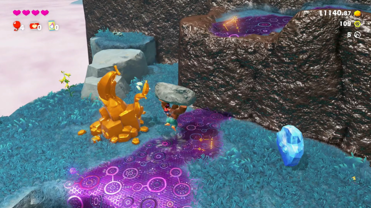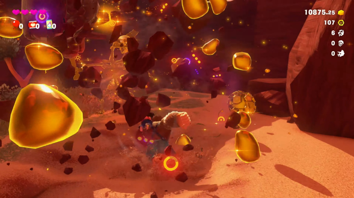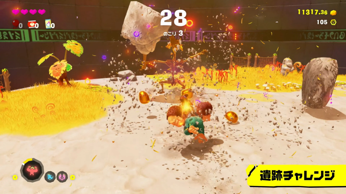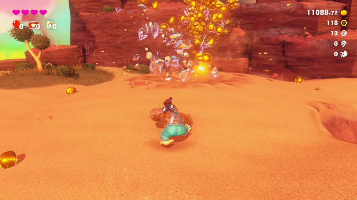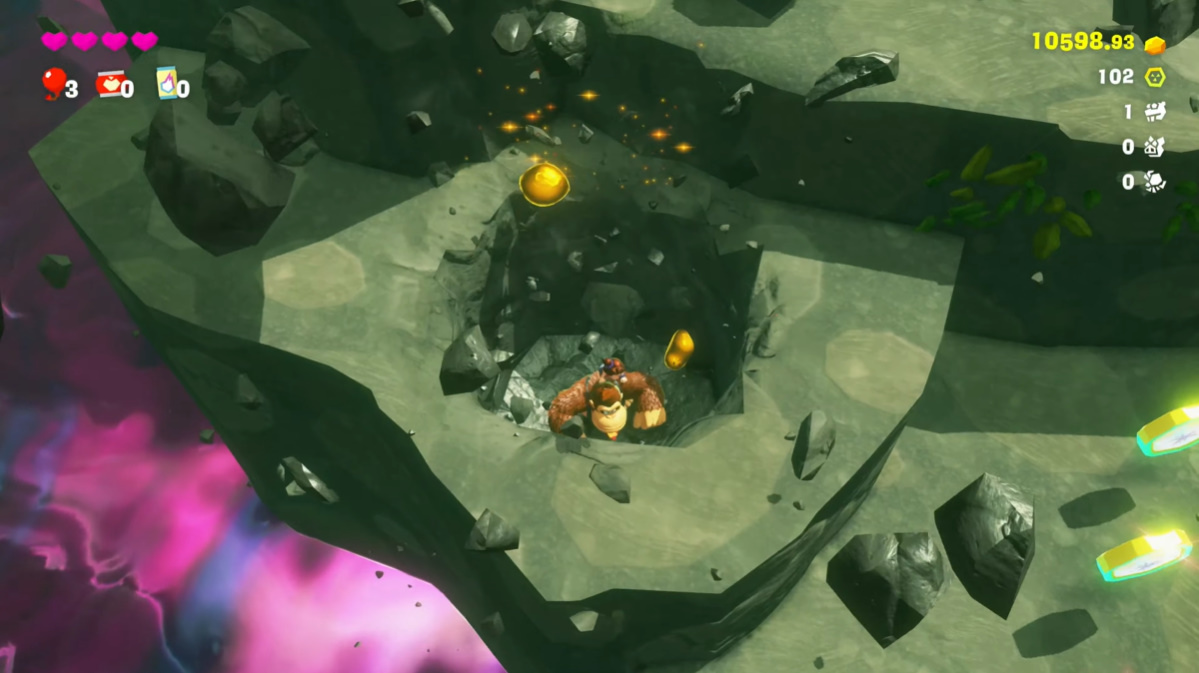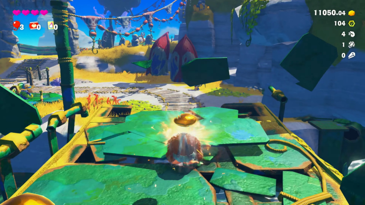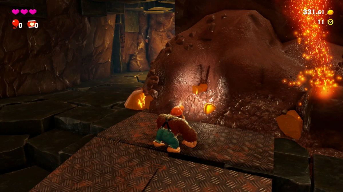 除了利用拳頭將岩石、地面等阻礙全部打掉開創前路外,玩家還可以利用更加強大的下墜拳來敲擊挖掘地面,藉此不斷往地底前進。除此之外,也能透過抓住地面碎片來做為武器迴轉攻擊,或是拿岩石地面碎片當作滑板快速移動(也可以拿來在水面上當作水上滑板移動),或是投擲出去,或是利用這些岩石地面碎片進行二次跳躍;透過咚奇剛強大的拳頭威力,讓玩家可以自由前進,探索這片美麗廣闊的 3D 世界。