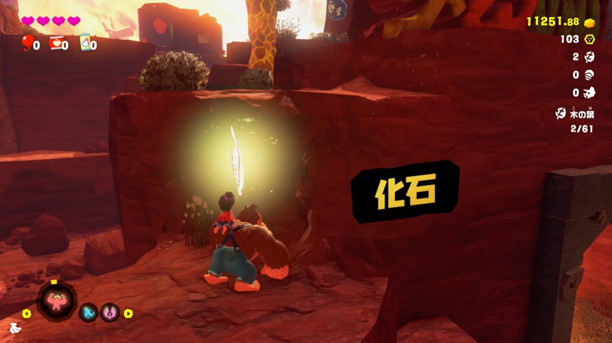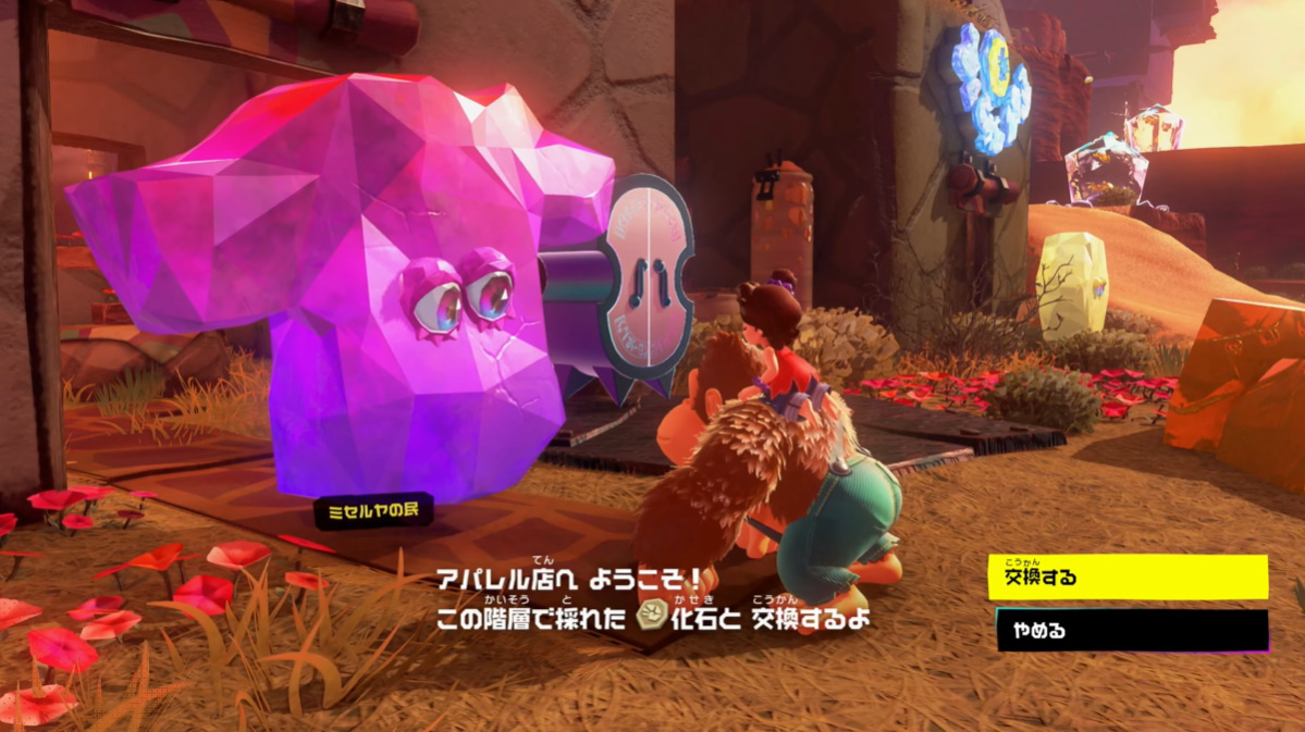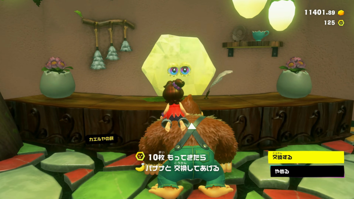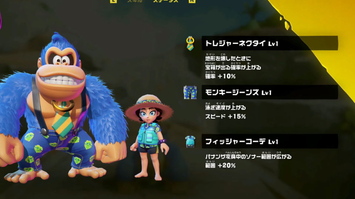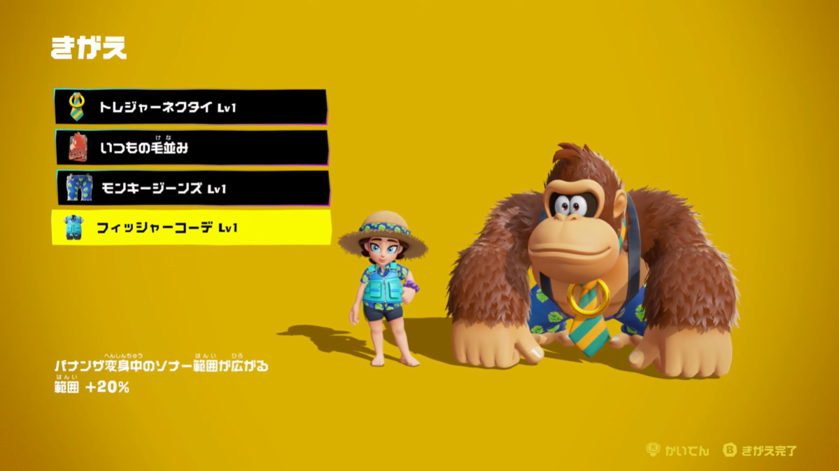 除此之外,遊戲中還會有各種「化石」登場,玩家也可以將收集到的化石拿去店裡進行交換,藉此來取得各種外觀服裝道具。這些外觀服裝道具除了能改變咚奇剛與波琳的外觀外,其中某些服裝還會有各種不同能力加成(如提升咚奇剛游泳速度+15%、延長波琳變身歌聲時間+10%),對玩家的冒險可說是幫助良多。
