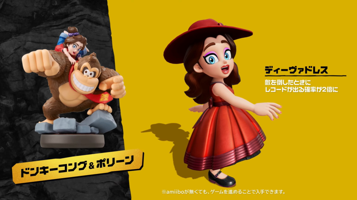 隨著本作即將發售,官方也確定會推出咚奇剛&波琳 amiibo 登場。玩家只要讀取咚奇剛&波琳 amiibo 進入遊戲,可以獲得波琳用的歌姬禮服,能讓打倒敵人時出現唱片的機率變成兩倍。
