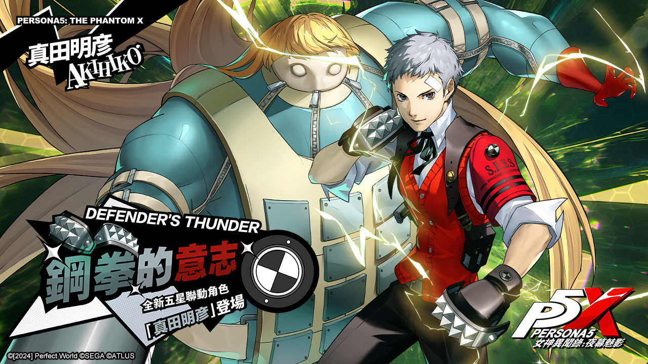 與《P3R》聯動限定全新五星限定電擊屬性支配角色「真田明彥」(CV:綠川光)是月光館學園高中三年級的學生,也是 S.E.E.S. 的創始人。能文能武的他是拳擊社的核心成員,在學校有一群粉絲。真田明彥擁有超群的自制力,偶爾會比較固執。他的初始人格面具為「波呂狄烏刻斯」。