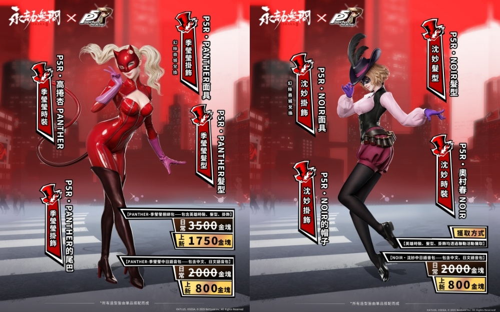 《永劫無間》即將迎來四週年,官方搶先公開與《女神異聞錄5 皇家版》的重磅聯動消息,為玩家獻上驚喜大禮。此次聯動讓無塵、季瑩瑩、胡桃、沈妙四位角色華麗變身,分別穿上「P5R.雨宮蓮 JOKER」、「P5R.高卷杏 PANTHER」、「P5R.芳澤霞 VIOLET」、「P5R.奧村春 NOIR」怪盜團經典成員角色外觀,完美重現人氣角色的獨特魅力!