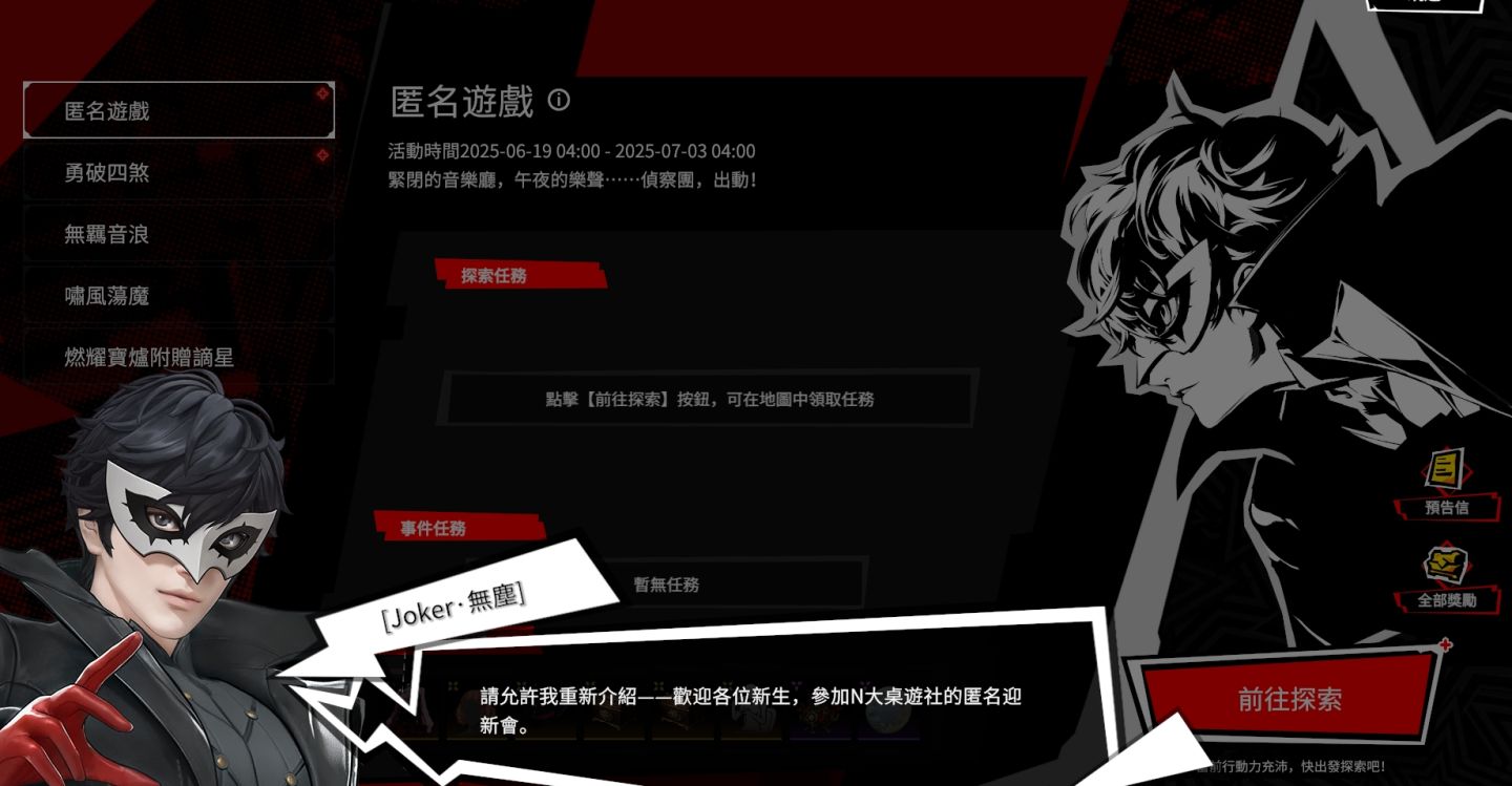 本次聯動活動同步推出限時挑戰「匿名遊戲」,福利滿載、誠意十足!活動期間,玩家只需每日首次登入活動頁面或完成指定任務,即可獲得「反抗之心」道具,用於關卡探索並解鎖獎勵進度。完成通關更可直接獲得沈妙時裝「P5R.奧村春 NOIR」!參與活動過程還有機會獲得沈妙極品表情動作「NOIR.總攻擊」、「怪盜頭像禮包」、「怪盜氣泡表情禮包」等多項稀有獎勵!