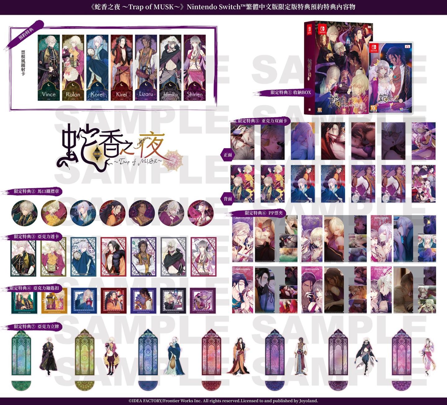 凡預訂《蛇香之夜 ~Trap of MUSK~》Nintendo Switch亞洲繁體中文版的玩家,將獲得精美預購特典:票根風鐳射卡一套(全 7 款,含女主角)。