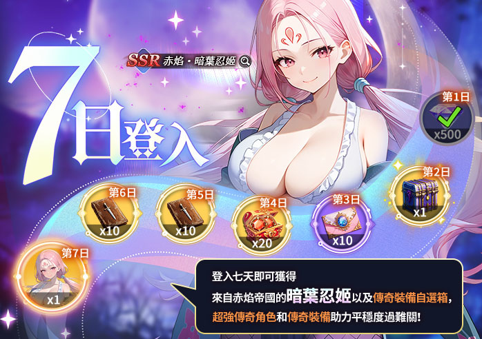 登入七天即可獲得來自赤焰帝國的傳奇英雄「暗葉忍姬」,超強傳奇角色助力平穩度過難關!