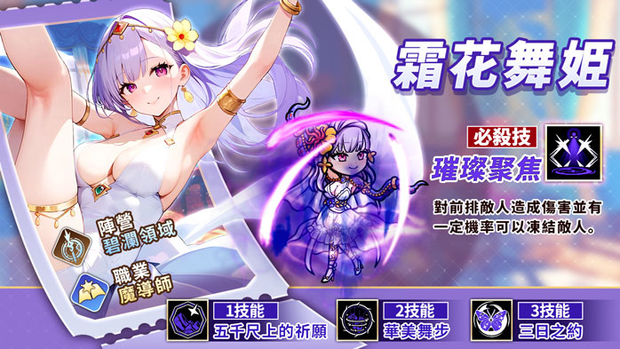 作為輔助型英雄,她以強大的干擾效果深受玩家好評。霜花舞姬的技能不僅能對敵人造成傷害,還能概使敵方無法行動,有效提升團隊生存能力。尤其在持久戰中,她能提供穩定的持續支援,幫助隊伍始終保持戰鬥優勢。