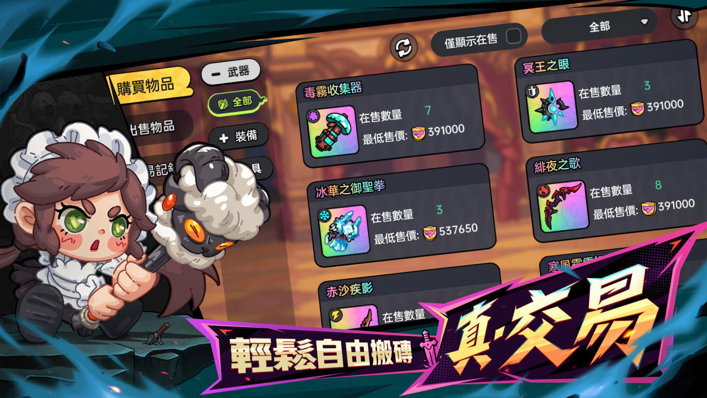 除了刷裝成長外,遊戲內建經濟系統支援玩家之間的自由交易。透過搬磚、打寶獲得的道具與裝備可於交易所販售與回收,打造屬於自己的獲利模式。無論是純粹戰鬥取樂,或喜歡研究市場、玩轉裝備流通,都能在遊戲中找到長期動力與成就感。