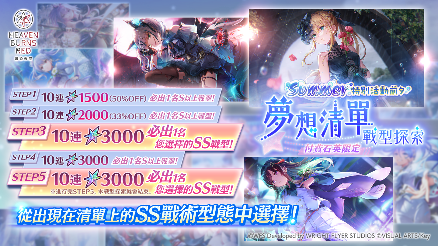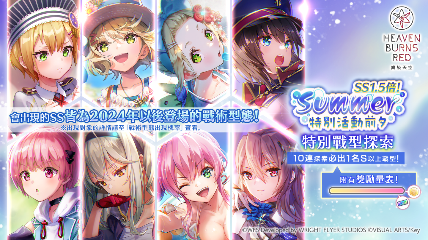 Wright Flyer Studios×Key《緋染天空 Heaven Burns Red》自 2025 年 6 月 20 日(五)上午 10 點起,舉辦限定 1 週的「SS 1.5 倍!Summer 特別活動前夕 特別戰型探索」。本戰型探索出現的 SS 戰術型態僅限 2024 年以後登場的戰術型態。