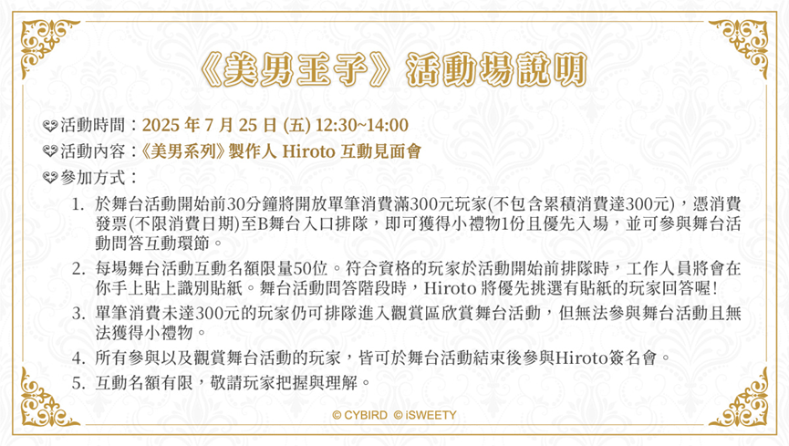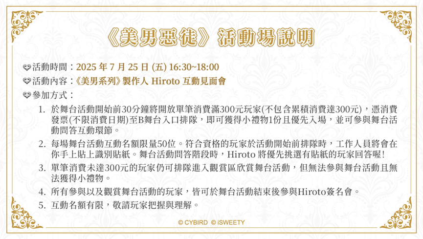 製作人倉増ひろと將出席這兩場活動。根據官方說明,欲參與舞台互動環節的玩家,需憑單筆消費滿300元之發票,於活動開始前30分鐘排隊入場。符合資格者可獲得一份小禮物並優先入座,每場名額為50位。活動結束後,將接續舉辦倉増ひろと的簽名會。