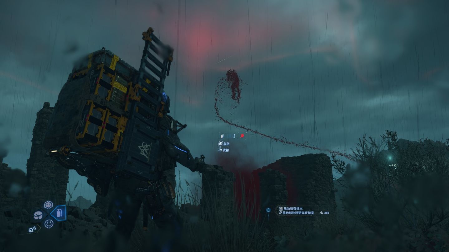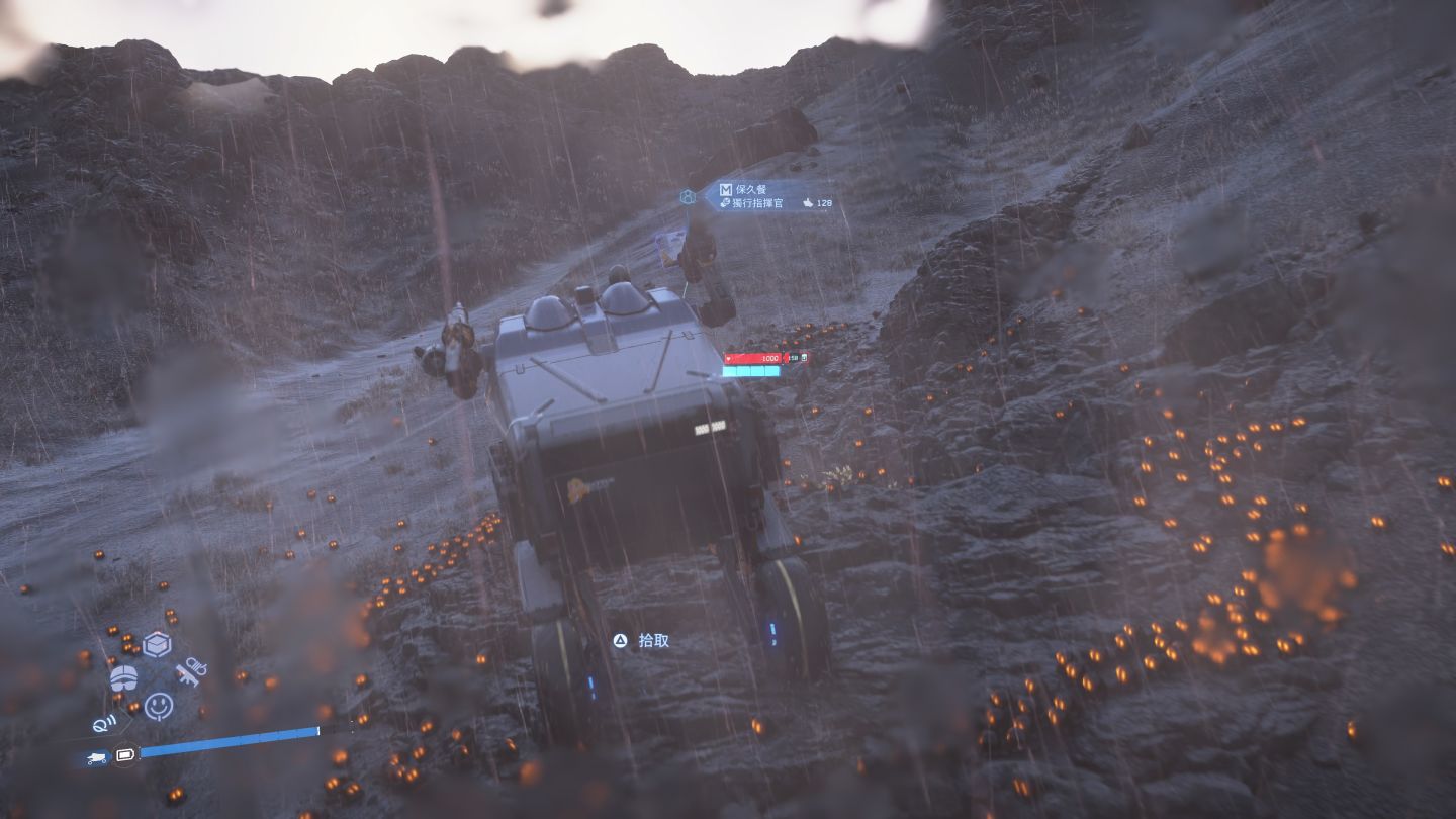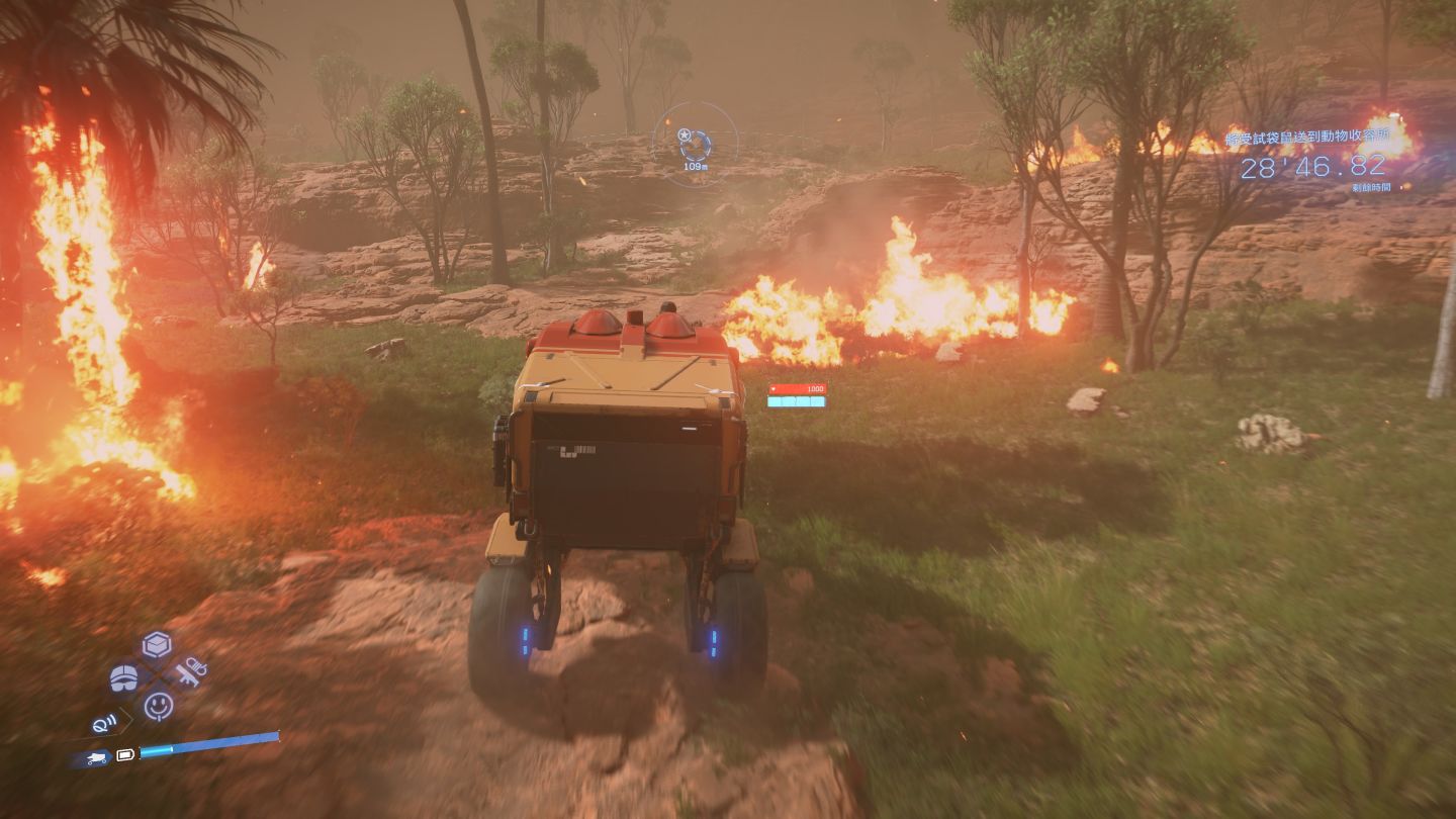 相較一代的美國荒地,Decima 引擎不僅帶來更嘆為觀止的原野地景,還是個會呼吸發怒的動態舞台。在本作送貨的途中,天候變化更加顯著:基礎款有驟然暴雨是 BT 的警訊,天外飛來的火球可能突然點燃森林大火,這次規劃的安全路線,或許在送貨當下並不安全。所謂計畫趕不上變化,幸好地形掃描功能依然實用。