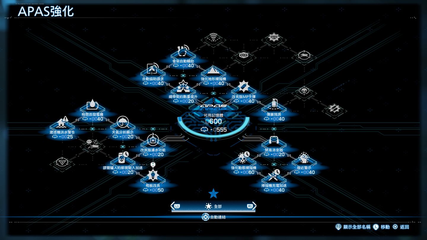 開若爾科技的進步完全體現在「APAS 強化系統」與「熟練度」等級上。APAS 技能樹很豐富,有明確分類:「送貨員」、「戰鬥」、「潛行」、「服務精神」、「布橋鏈」等,玩家可以根據自己的喜好配點,在戰鬥任務時特化為戰爭機器,送貨任務時甚至能有倒地貨物不散落的特殊功能。