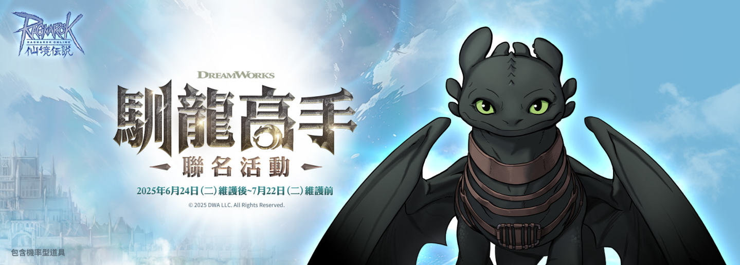為慶祝環球影業與夢工廠真人版動畫電影《馴龍高手》上映而舉辦本次聯名活動,活動時間將持續至 7 月 22 日遊戲維護前,玩家角色等級達 Base Lv.90 以上即可參加。活動期間《RO 仙境傳說Online》的深淵湖水將出現來自博克島的維京人與龍群,玩家將展開協助維京少年「小嗝嗝」以及他的夜煞龍夥伴「沒牙」等朋友們回到博克島的故事任務。