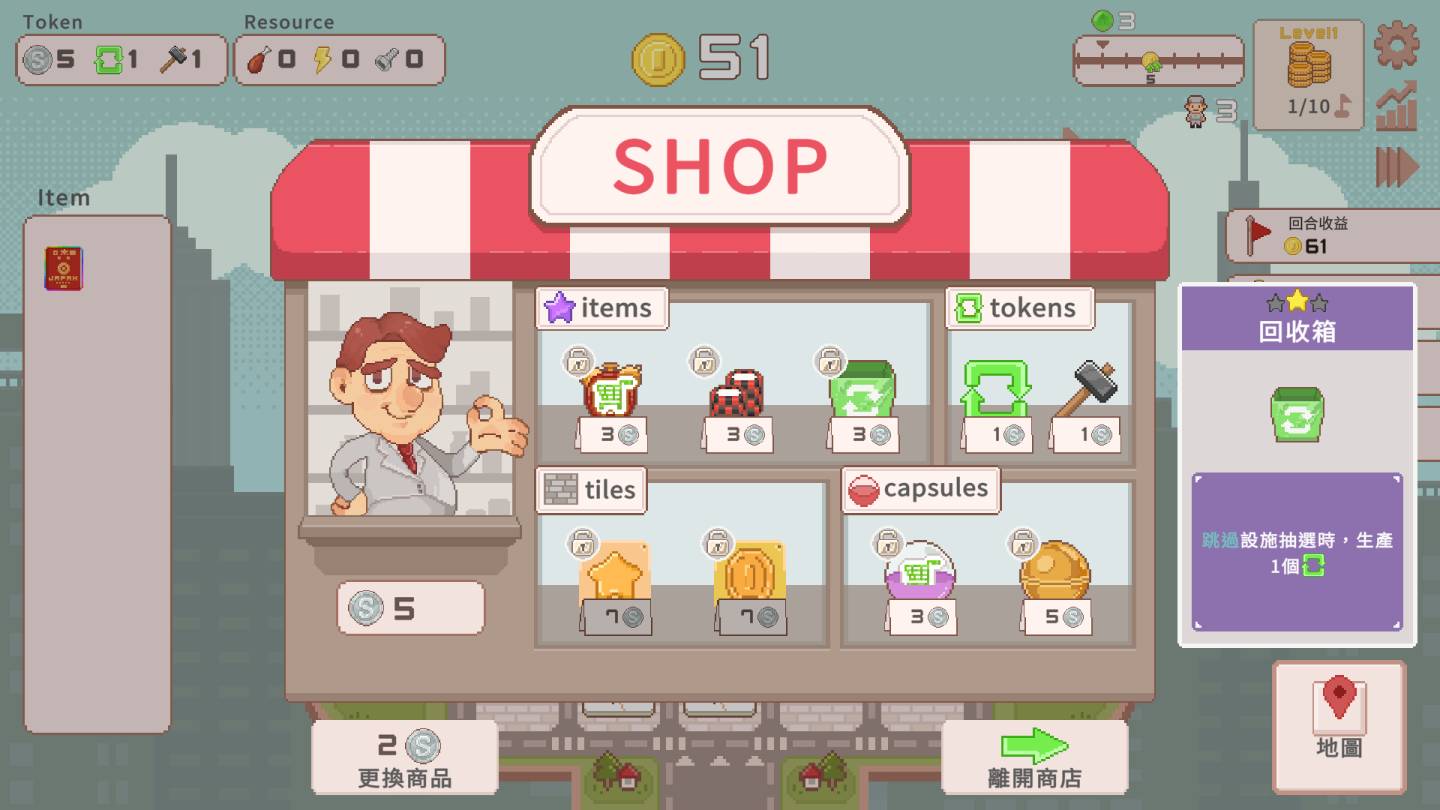 角色會在地圖上自己行動賺錢,就像看著一款輕鬆療癒的放置遊戲。可愛像素風的畫面,加上賺進大量金幣時的特效,帶給你一場視覺上的享受。