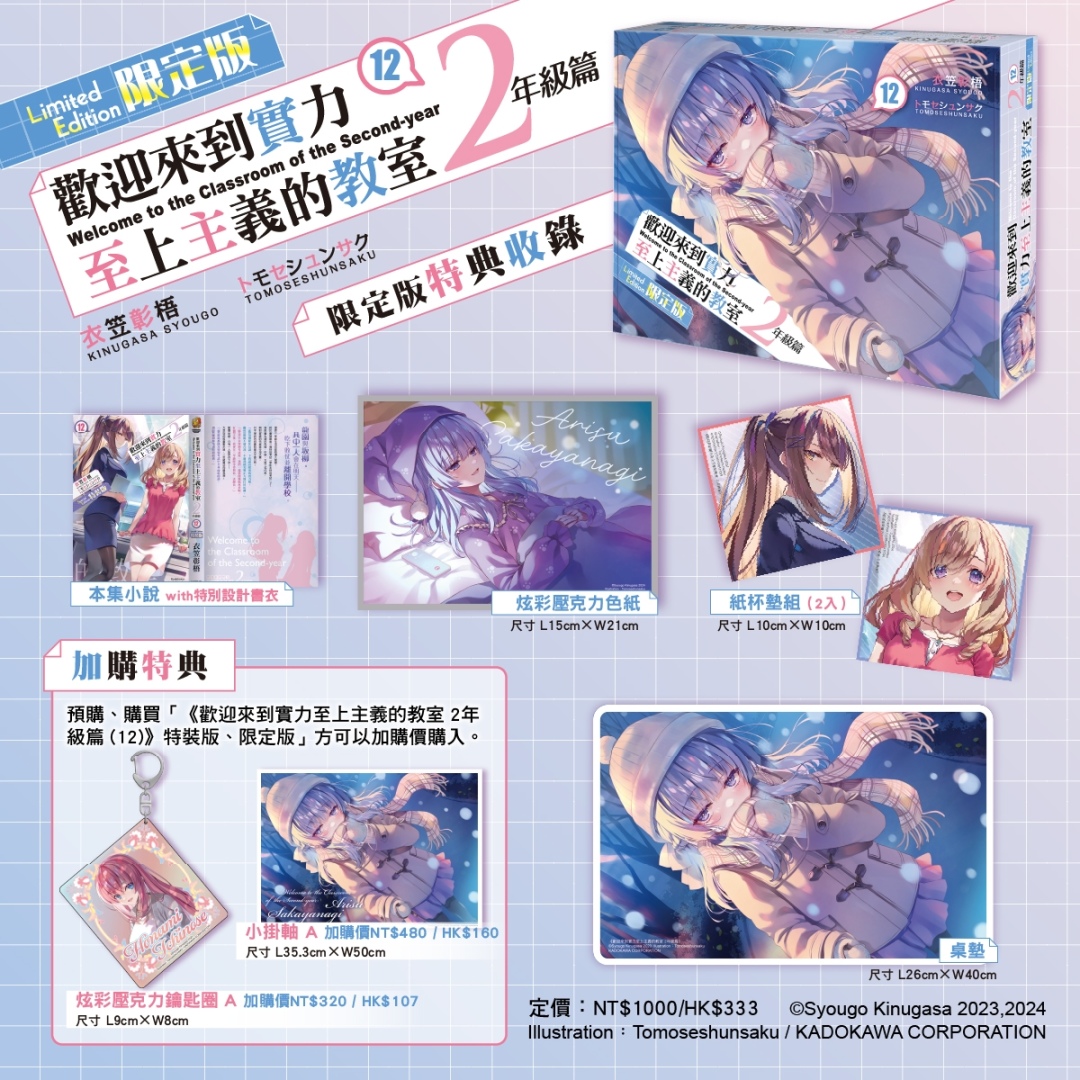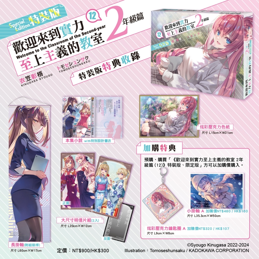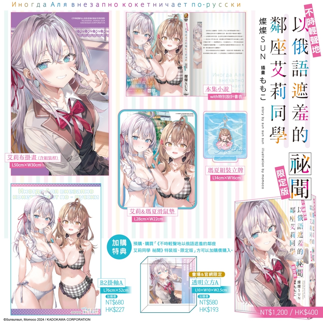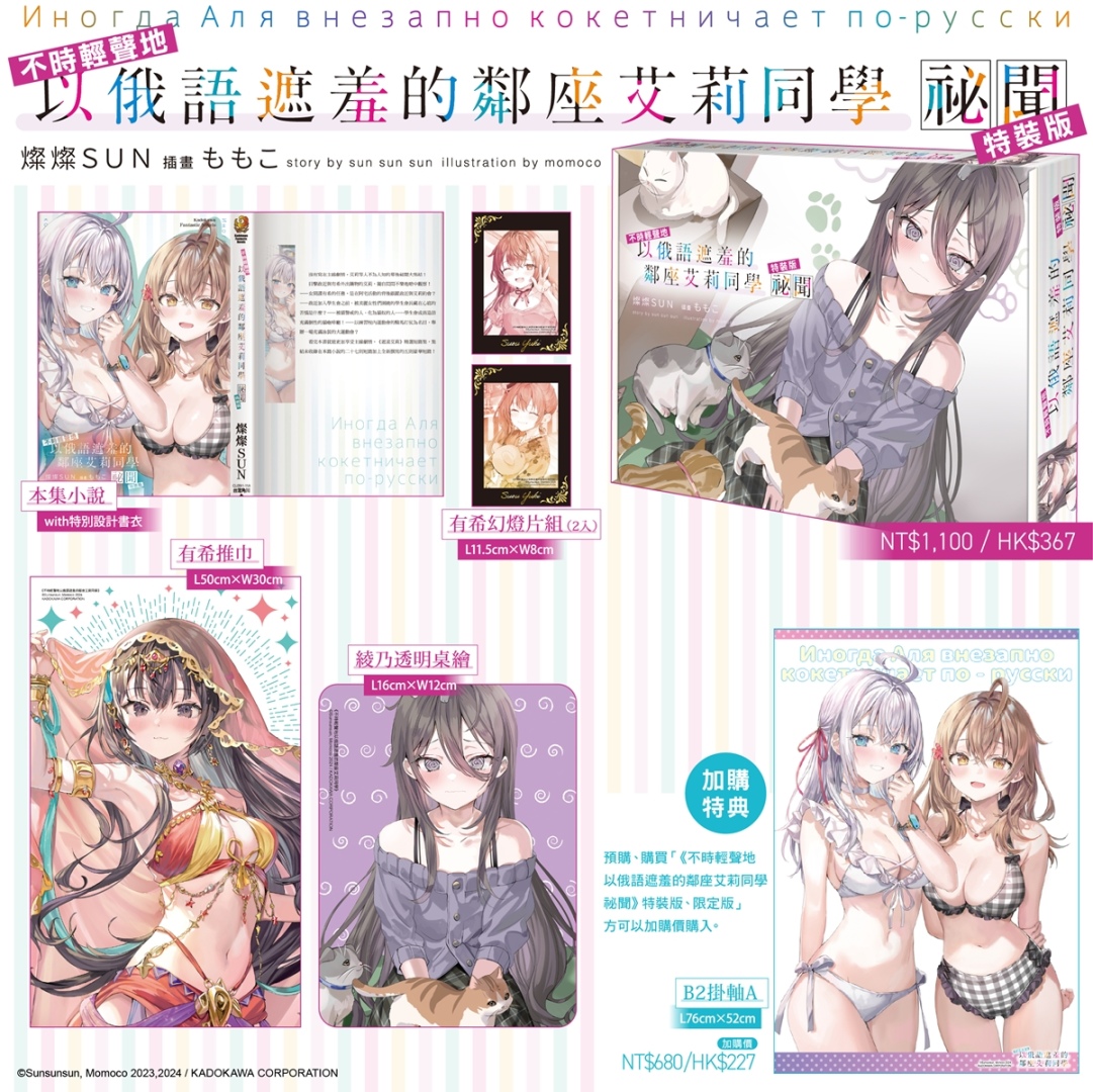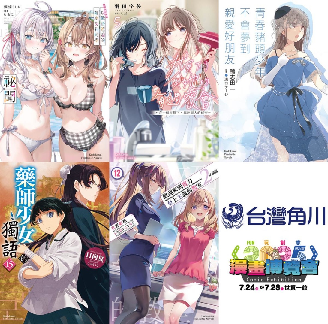 收錄 27 則未公開短篇與 5 則全新撰寫故事的超人氣戀愛喜劇短篇集《不時輕聲地以俄語遮羞的鄰座艾莉同學祕聞》;2025年7月動畫,由鴨志田一&溝口ケージ獻上的超人氣輕小說本傳完結篇《青春豬頭少年不會夢到親愛好朋友》;校園戀愛百合話題作《我買下了與她的每週密會 (5) ~在一個屋簷下,屬於兩人的祕密~》;以懸疑與藥理交織出古風奇幻的命運漣漪的續篇故事《藥師少女的獨語 (15)》以及累銷突破 840 萬冊的超人氣校園鬥智輕小說二年級篇最高潮《歡迎來到實力至上主義的教室 2年級篇 (12)》,都將於台灣角川漫博會場首賣。