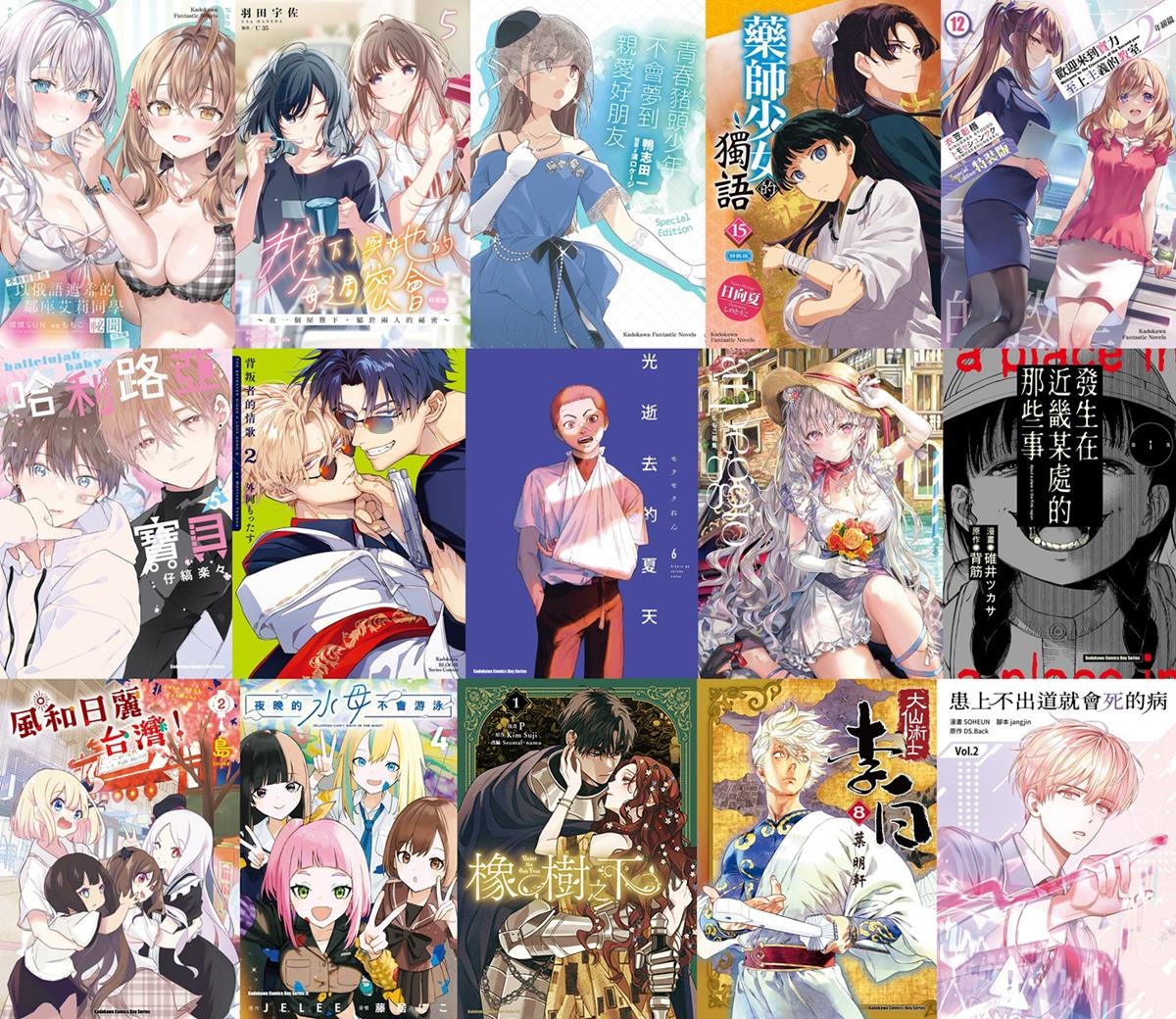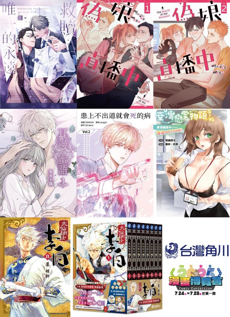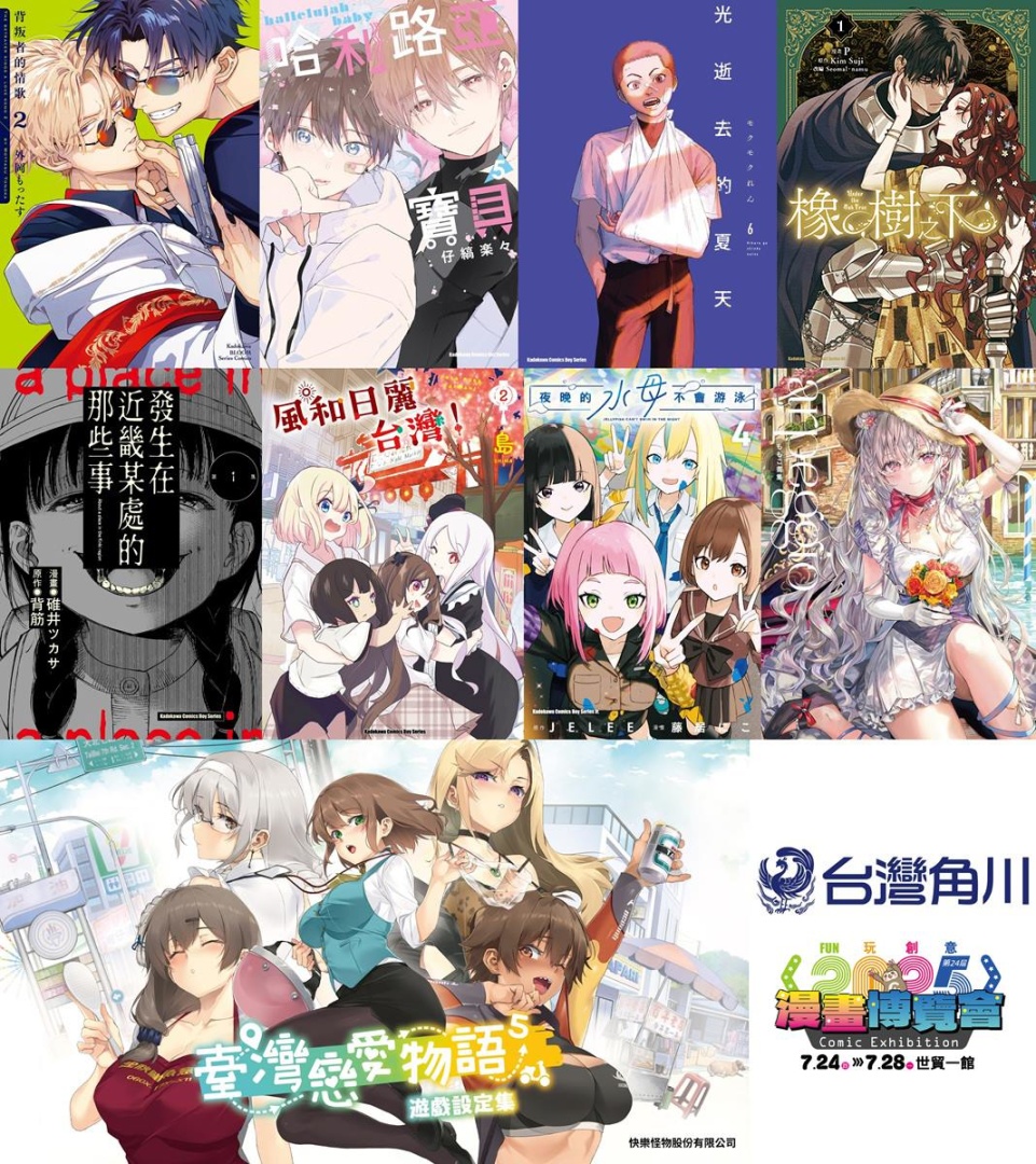 大受好評的異國黑手黨 BL 戀愛故事續篇《背叛者的情歌 (2)》;同樣是 7 月新番的青春恐怖話題原作漫畫《光逝去的夏天 (6)》;本屆特邀作者首度來台舉辦簽名會、跨越主從關係的雙向寵溺 BL 漫畫《哈利路亞寶貝(5)》;超人氣的繪師ももこ的全新畫集《ももこ畫集 arpeggio》;原作小說於日本熱銷超過 10 萬冊,改編漫畫化的懸疑驚悚作《發生在近畿某處的那些事 (1)》;描繪以台灣為舞台的日常喜劇第二集《風和日麗台灣!(2)》;原作遊戲系列 Steam 銷售突破20萬套的超人氣國產遊戲《臺灣戀愛物語⁵》全彩遊戲設定集;熱播原創動畫漫畫版續集《夜晚的水母不會游泳 (4)》;以及原作小說榮獲 RIDI 羅曼史小說獎網路小說部門、電子書部門大獎!令人心動又焦急的浪漫奇幻故事改編漫畫《橡樹之下 (1)》……等。