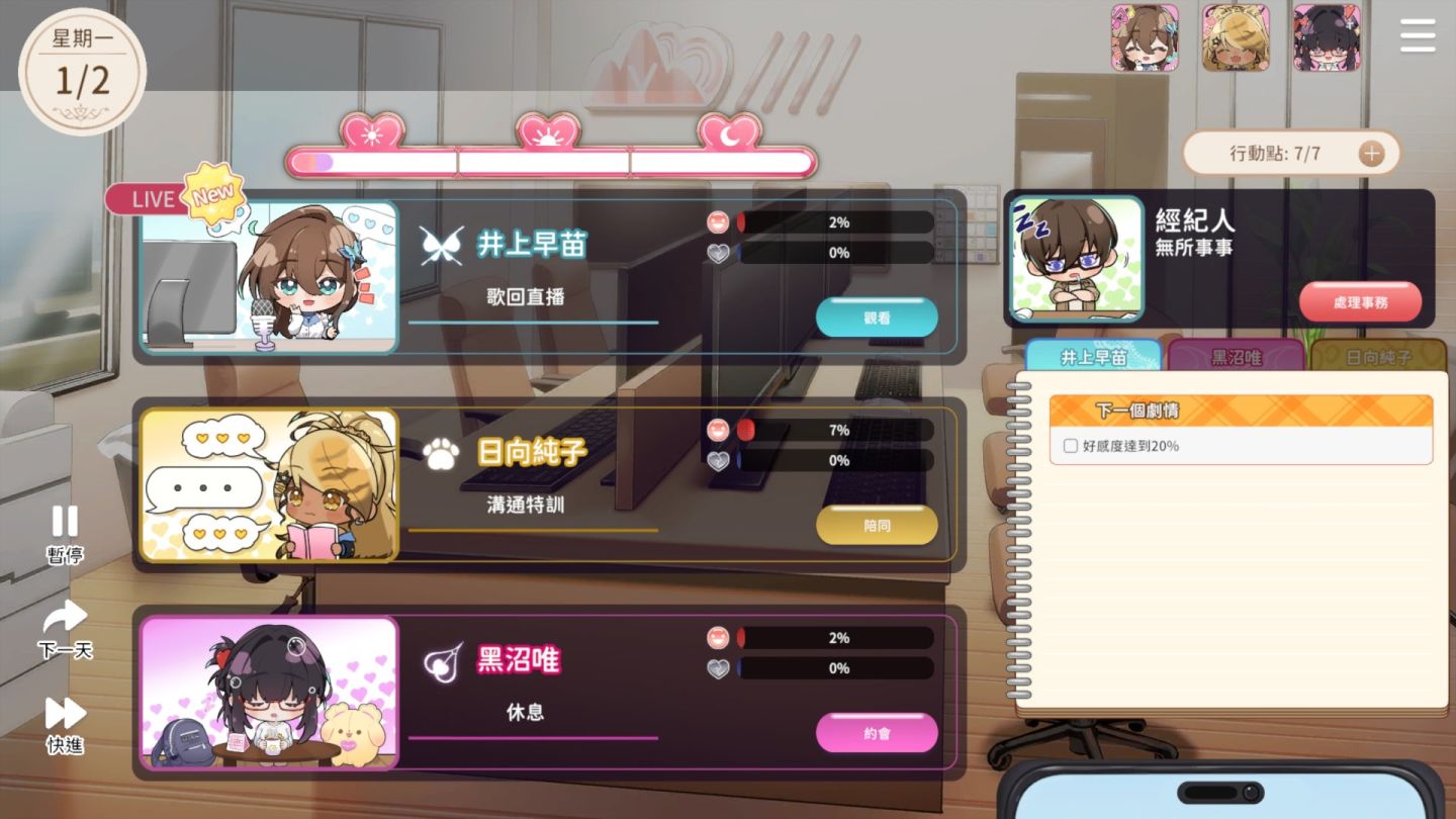 遊戲中包含超過 180 張高品質 CG、多套換裝,以及豐富的小遊戲與節日活動,讓每次遊玩都充滿新鮮感。此外,三位女主角皆由日語聲優全程演出,搭配超過 15 萬字的劇情文本,打造出沉浸感十足的戀愛育成旅程。玩家的每一個選擇都將影響她們的未來,是邁向人氣巔峰,還是譜出專屬於彼此的親密關係,一切都掌握在你手中。