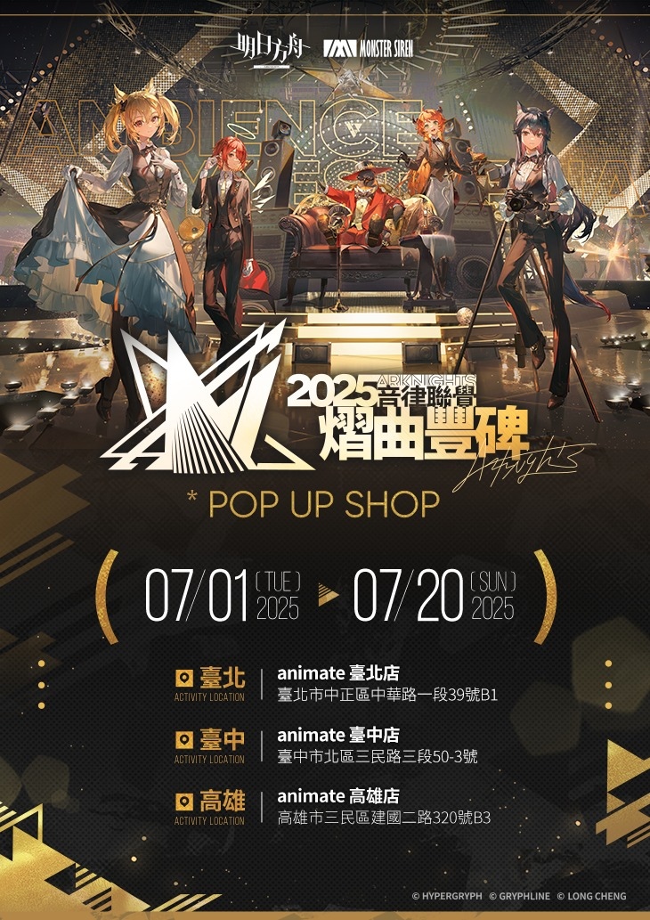 除觀賞會活動外,《明日方舟》亦宣布自 7 月 1 日起至 7 月 20 日,將於 Animate 台北店、台中店、高雄店設立限時周邊販售專區,限時販售《2025 音律聯覺 - 熠曲豐碑》周邊商品。無論是否參與觀賞會,粉絲皆可至 Animate 實體店面現場選購心儀商品,機會難得,敬請把握!