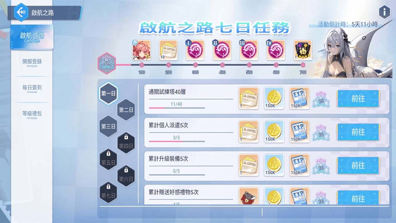 6 月 25 日開服起,社長大人在完成新手引導後,期間內開啟「啟航之路」活動介面將可查看每日與任務,達成活動指定任務後即可獲得任務點數,隨著點數累積、「啟航之路」中的獎勵將一一解鎖!包含強力 SSR 千代、高級招募券、SSR 符文……而強力光暗 SSR 自選卡,將作為本次最終大獎,正等待著完成啟航之路的社長親自領取!