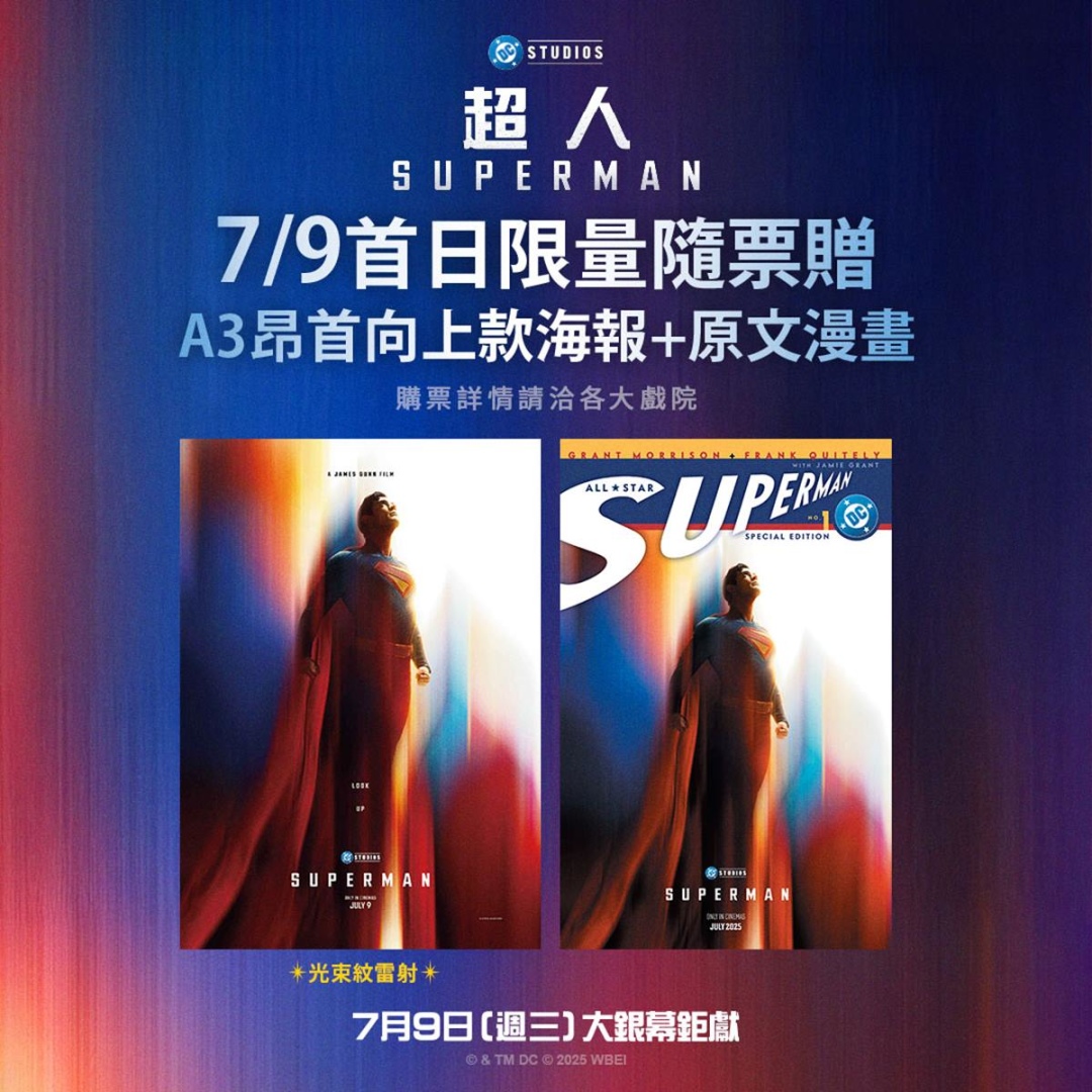 《超人》預售票將於今(25)日開賣,購票即可獲得限量「開創紀元款」海報,首日場次更將隨票贈「昂首向上雷射光束A3海報」、原文漫畫等限量特典,詳情請洽各大影城。電影將於 7 月 9 日(週三) 2D · 3D · IMAX · 4DX · MX4D · Atmos · Dolby Cinema · SCREENX 同步上映。