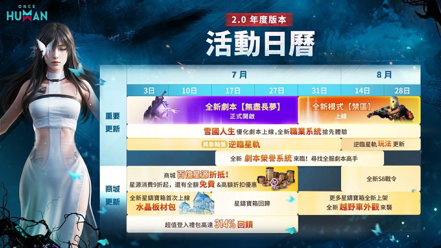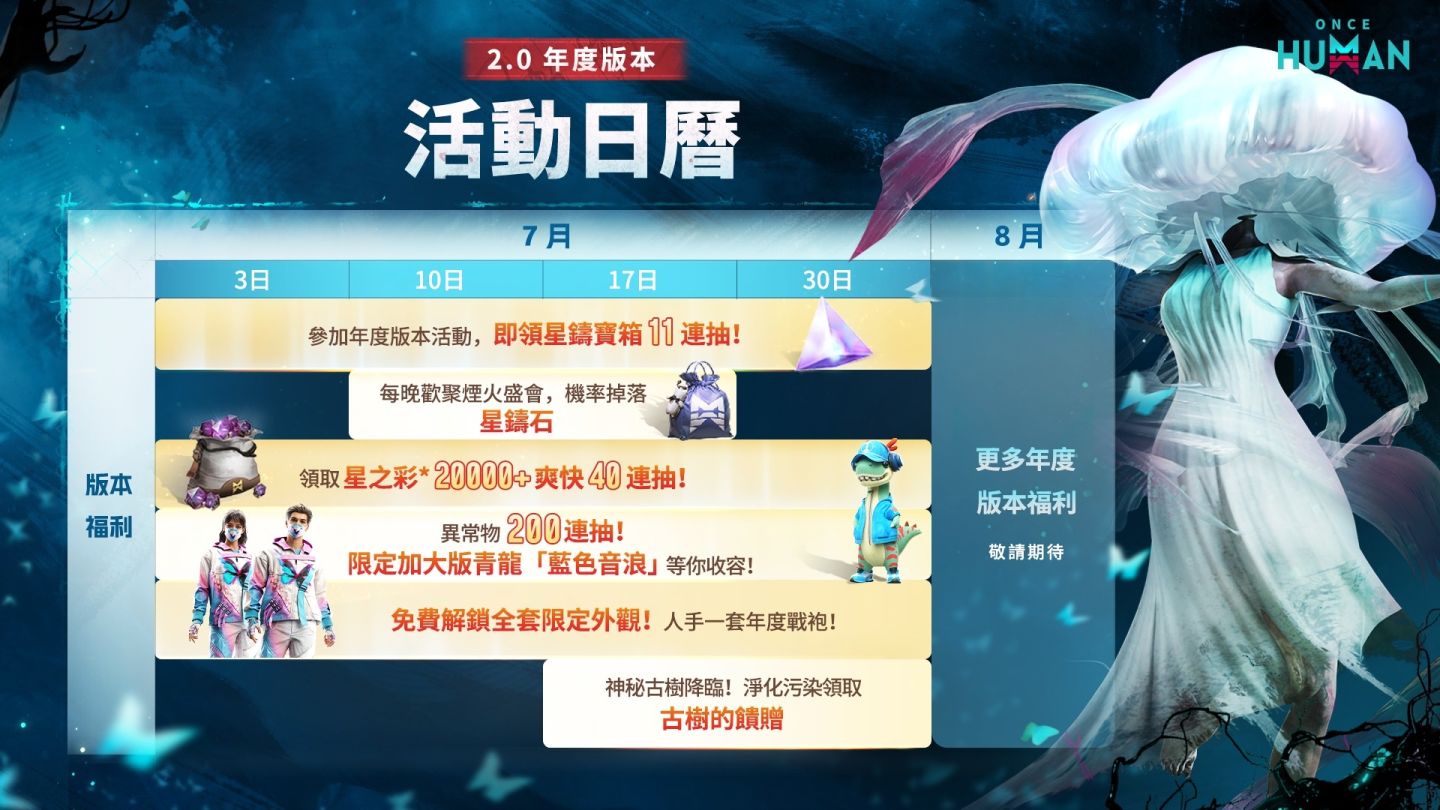為迎接暑假一連串的更新與活動,官方特別製作《Once Human》「活動日曆」,包含版本福利、重要更新以及商城更新等三大項目,讓超越者一目了然未來的更新日程!