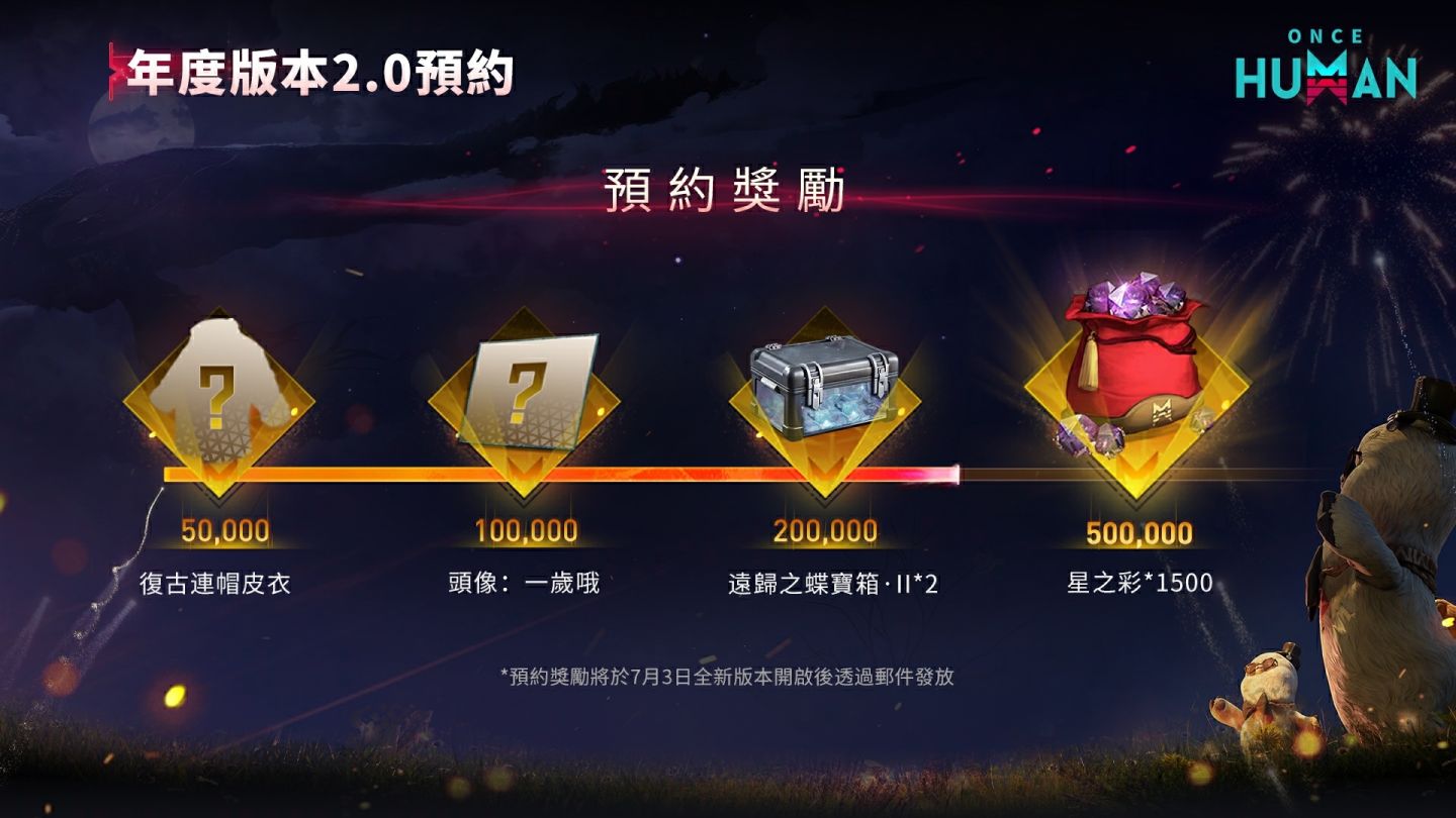 《Once Human》2.0 年度版本「奇夢破曉」現已在官網開放預約,成功預約的玩家將可獲得限定好禮,包含復古連帽皮衣、頭像:一歲哦、遠歸之蝶寶箱×2 以及 1,500 星之彩,豐富獎勵絕對不容錯過!