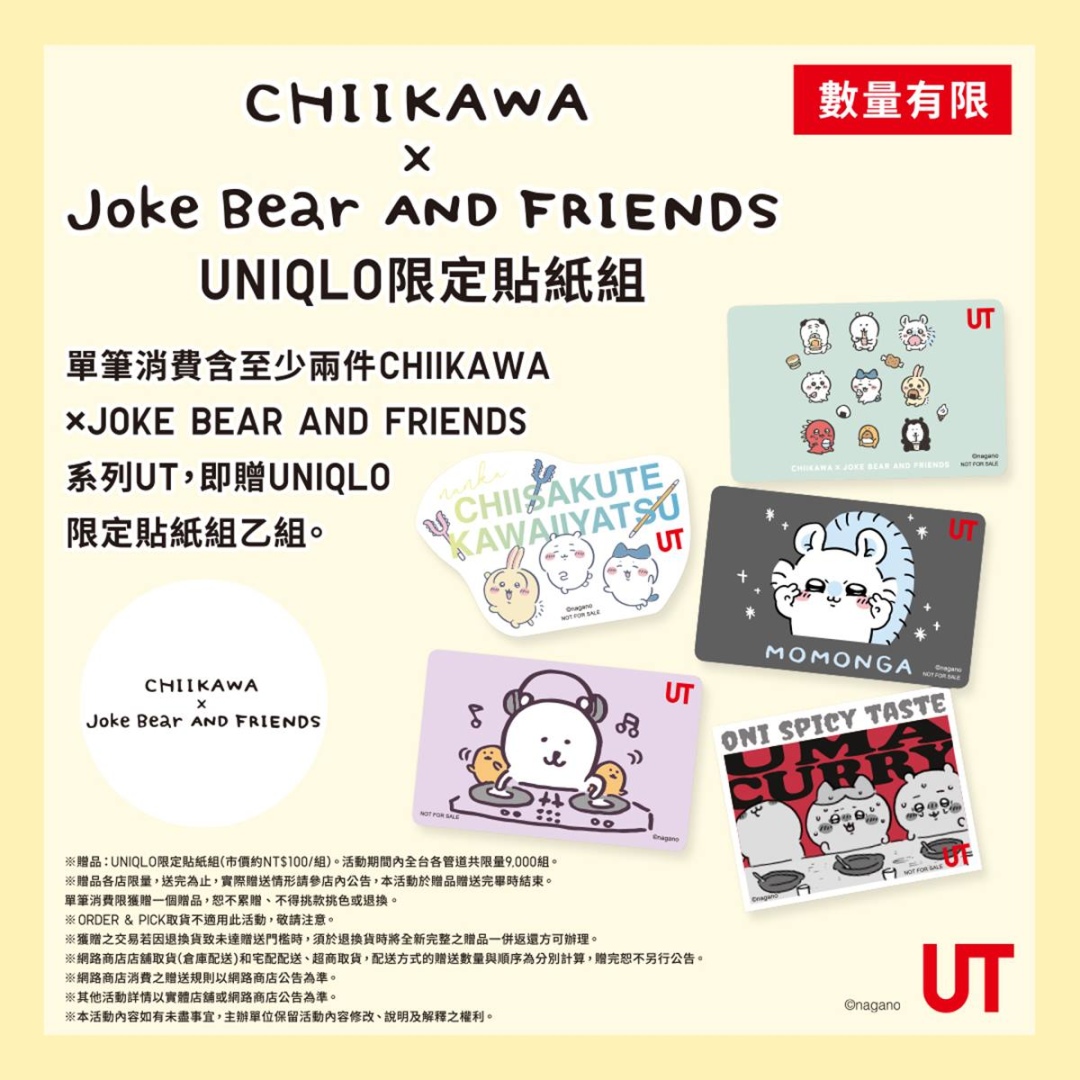 2025/06/30(一)起,於 UNIQLO 實體店舖單筆消費含至少兩件 CHIIKAWA x JOKE BEAR AND FRIENDS 系列 UT,即有機會獲得 UNIQLO 限定貼紙組乙組,恕不挑款不累贈,每日不限量,贈完即提早結束活動,實際贈送狀況以各店內公告為準。