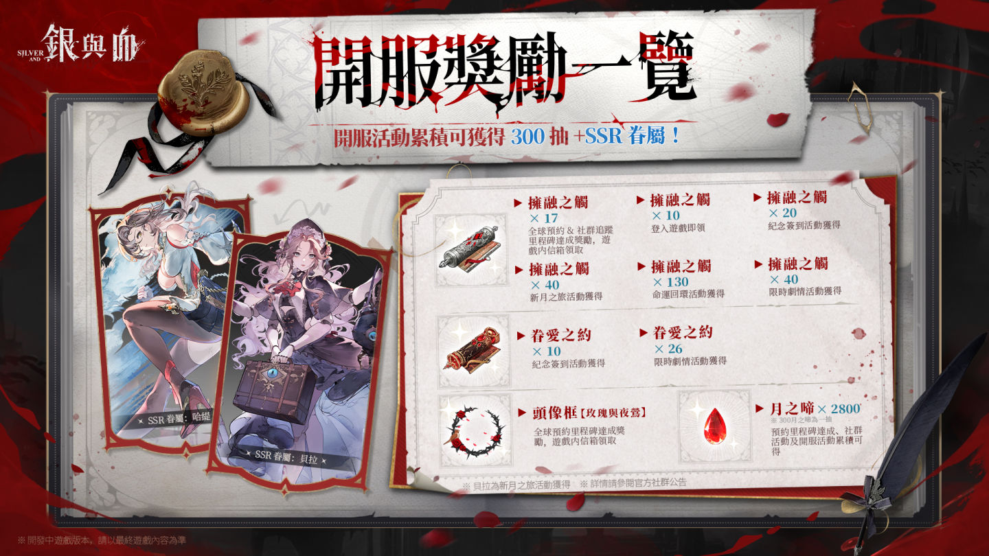 開服基於達成全球1000萬預約的里程碑,所有玩家將獲得SSR眷屬「哈緹」。此外,一系列開服活動預計可讓玩家累計獲得最多300次抽卡機會,以及SSR角色「貝拉」。活動包含登入獎勵、連續簽到獎勵、主線任務達成獎勵,以及限時劇情活動等,這些活動將陸續開放,預計能獲得「擁融之觸」、「月之啼」、「眷愛之約」、「完美碎魄」等遊戲內道具與角色。