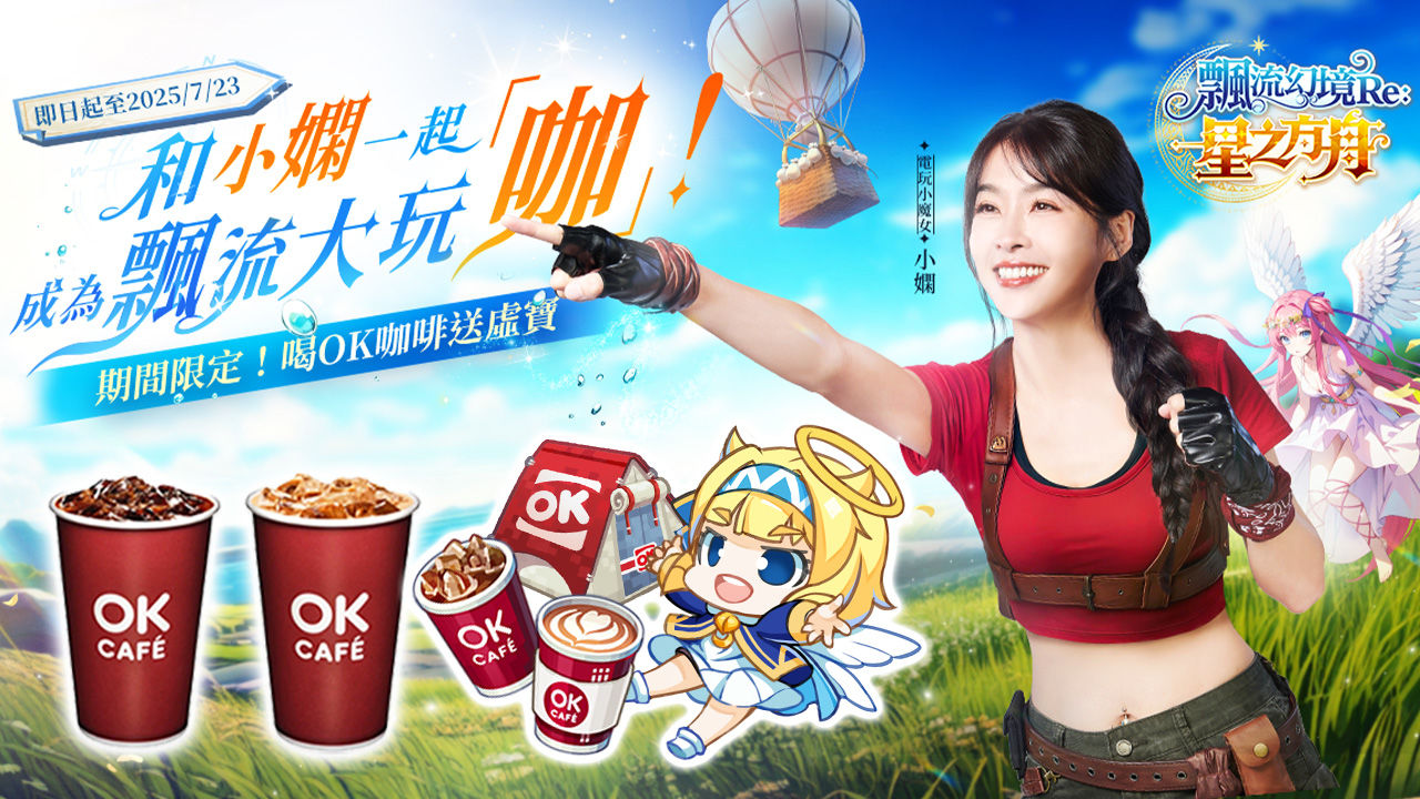 《飄流幻境 Re:星之方舟》正式登陸全台 OK 超商實體門市!遊戲聯名合作推出 OK café 聯名形象杯身,跟著電玩小魔女一起成為飄流大玩「咖」!即日起至 7 月 23 日期間至全台 OK 實體門市消費 OK café,可獲得《飄流幻境 Re:星之方舟》「OK 超商聯名福袋」限量虛寶序號;有機會抽中獨家造型帳篷、各式補品道具、潛能激發丸、混沌結晶等優質虛寶。
