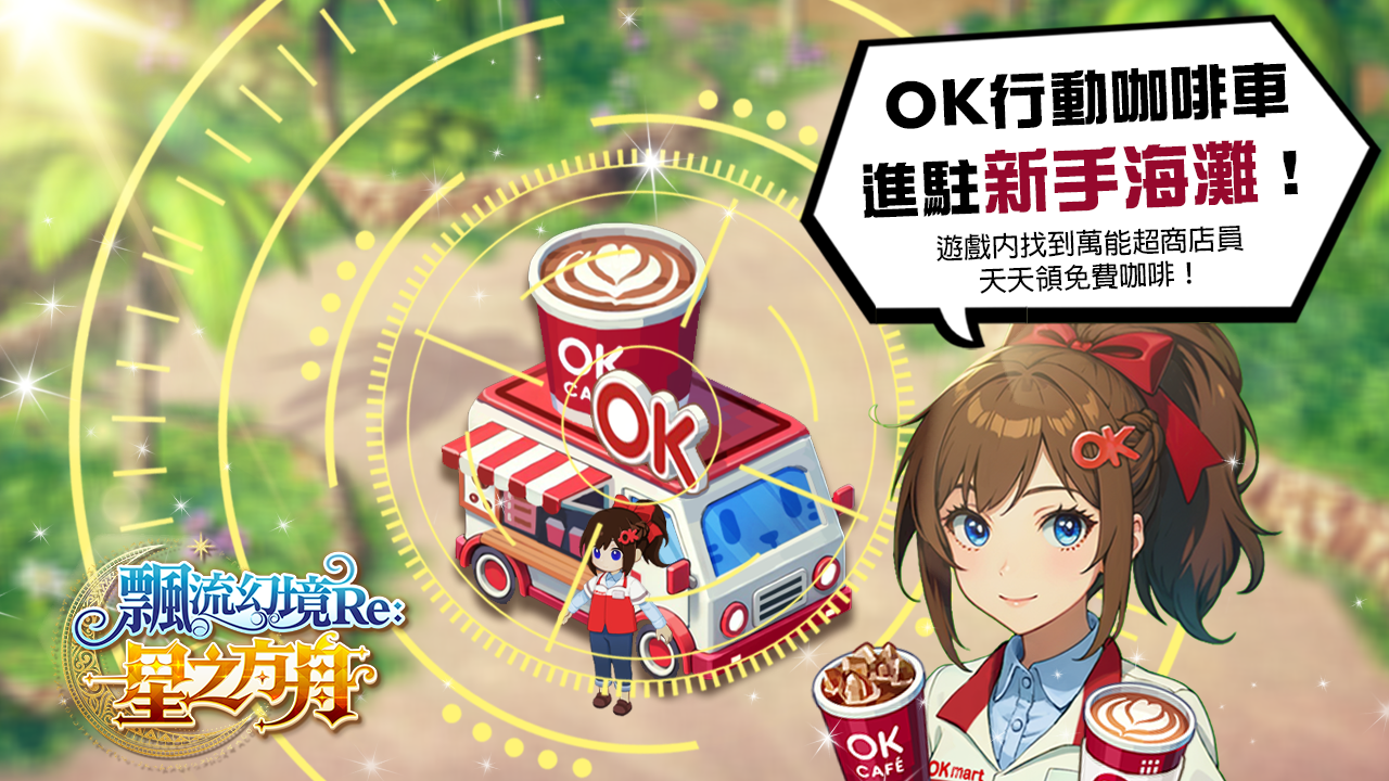 為紀念聯名合作,「OK 行動咖啡車」合作期間將進駐到遊戲中!今(26)日維護後至 7 月 24 日維護前,每天前往新手海灘尋找到萬能的「OK 超商店員」就可以領取免費咖啡補給品!滿月慶典期間讓你天天都有美味咖啡可以提神醒腦,探索世界事半功倍、狀態超 OK!