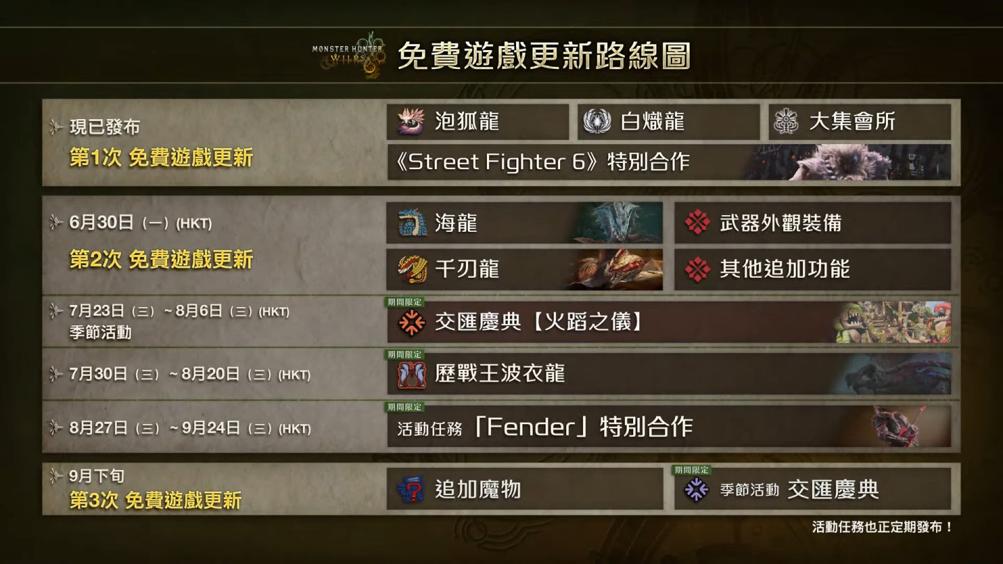 雖然《魔物獵人 荒野》目前已在 PlayStation 5、Xbox Series X/S 以及 PC(Steam)平台銷售中。免費標題更新第二彈預計於 2025 年 6 月 30 日上線,但根據官方公布的更新路線表,下次更新要等到九月才會有追加魔物登場。