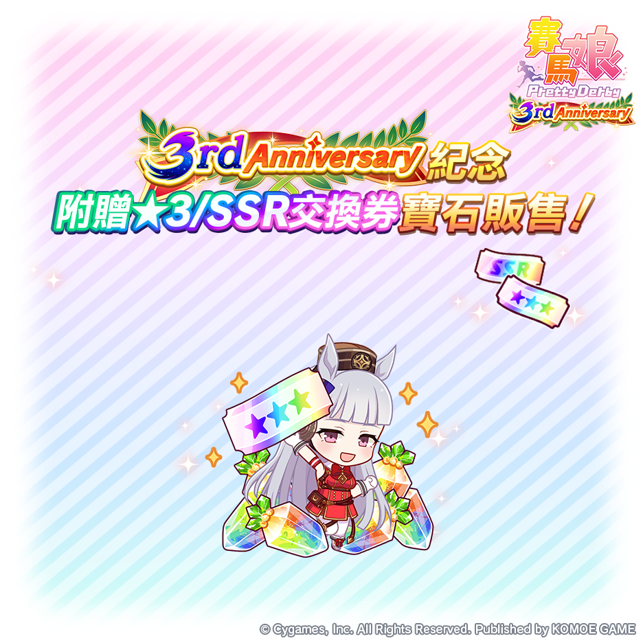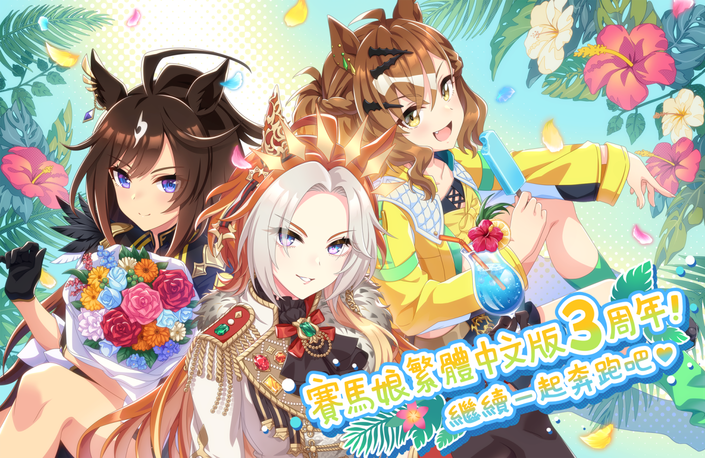 各位訓練員,今天 6 月 27 日,是《賽馬娘 Pretty Derby》繁體中文版的 3 週年生日,非常感謝各位訓練員一直以來的支持與厚愛!因為有你們和賽馬娘們一同奔馳與努力,才讓這段旅程如此閃耀!