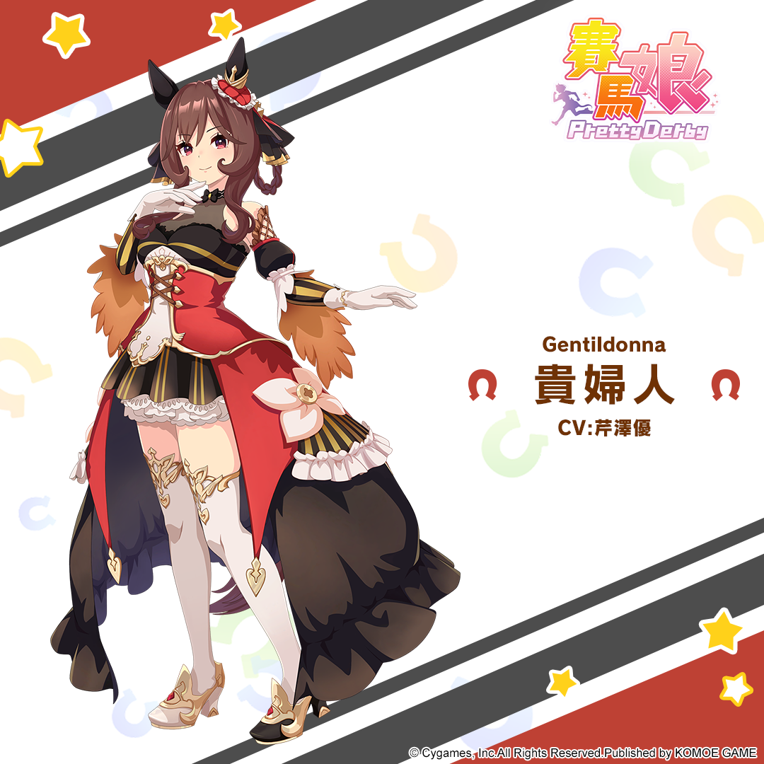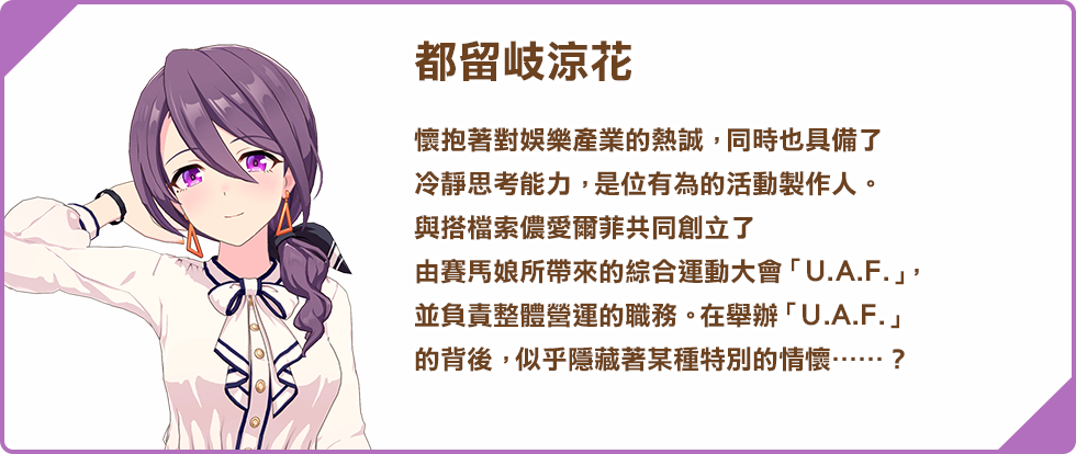 懷抱著對娛樂產業的熱誠,同時也具備了冷靜思考能力,是位有為的活動製作人。與搭檔索儂愛爾菲共同創立了由賽馬娘所帶來的綜合運動大會「U.A.F.」,並負責整體營運的職務。在舉辦「U.A.F.」的背後,似乎隱藏著某種特別的情懷……?