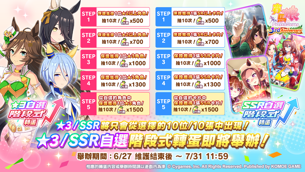 自 6 月 27 日維護結束後起,將舉辦分別設有 Step1 到 Step5 各 5 個階段的「★3/SSR 自選階段式轉蛋」「★3/SSR 自選階段式轉蛋」,抽取轉蛋即可使各別 Step 提升 1 個階段。