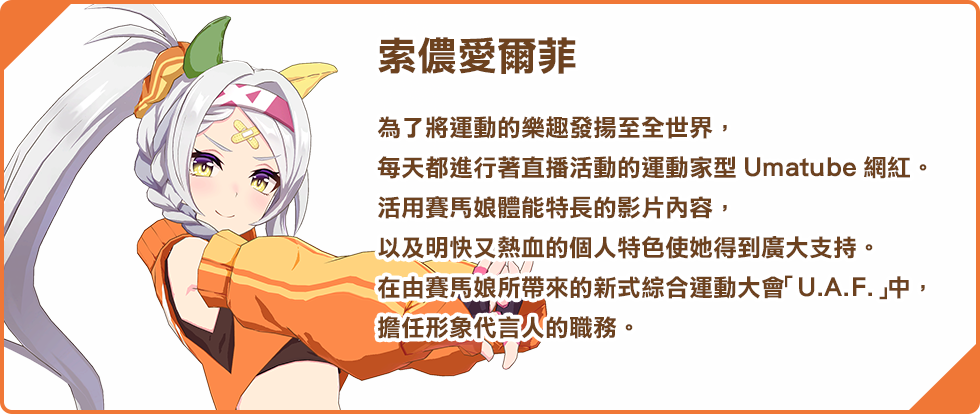 為了將運動的樂趣發揚至全世界,每天都進行著直播活動的運動家型 Umatube 網紅。活用賽馬娘體能特長的影片內容,以及明快又熱血的個人特色使她得到廣大支持。在由賽馬娘所帶來的新式綜合運動大會「U.A.F.」中,擔任形象代言人的職務。