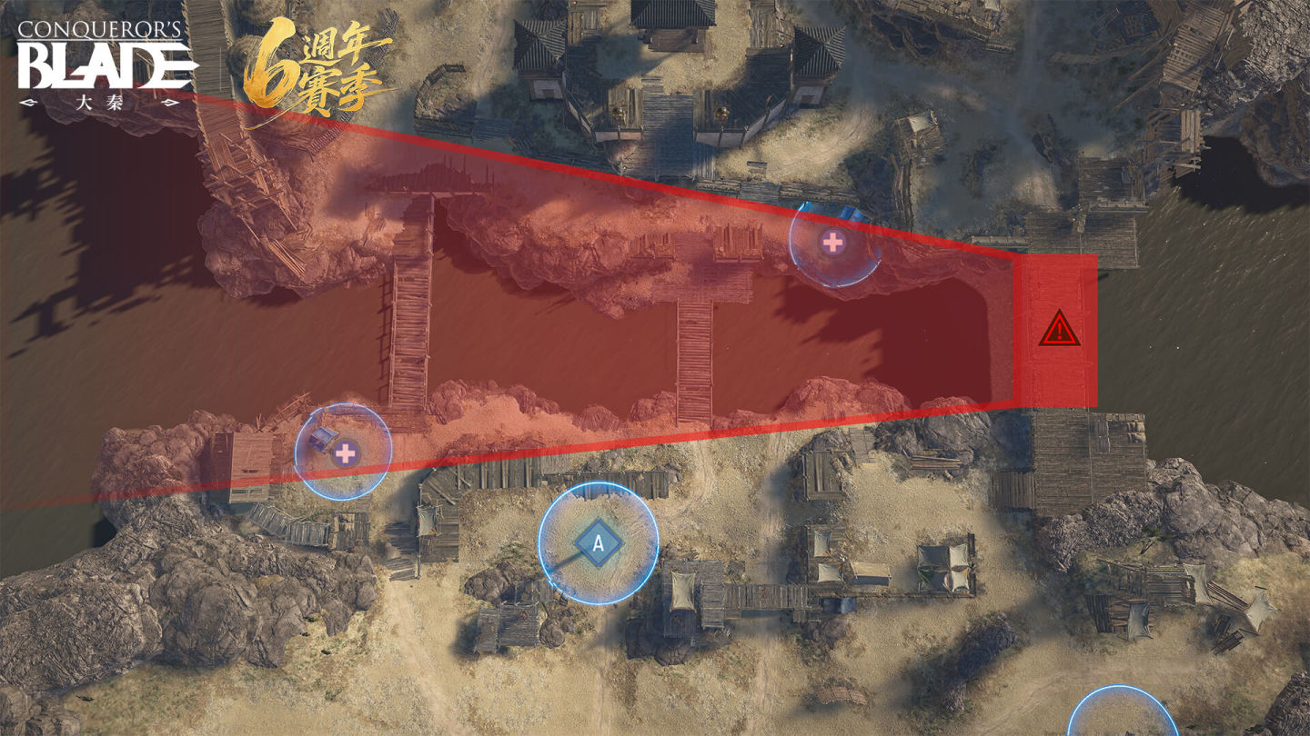 .特色機制「決堤放水」:控制「關前營寨」旗幟的一方,將派駐「水壩守衛」在大壩區域進行防禦。擊殺「水壩守衛」後,可以主動觸發「決堤放水」事件。噴湧而出的洪水將沿河道沖刷而下,擊殺下游河道範圍內所有武將和兵團,同時摧毀河面上的浮橋。請注意,觸發「決堤放水」事件後,河道範圍內的兩個補給點將會被摧毀,無法使用;河面將會上升,淹沒一部分河岸,落入該區域的武將和兵團將溺水而亡。事件結束一段時間後,河面上將重建一座新的浮橋,大壩缺口處也將臨時搭建一條可通行的通道。