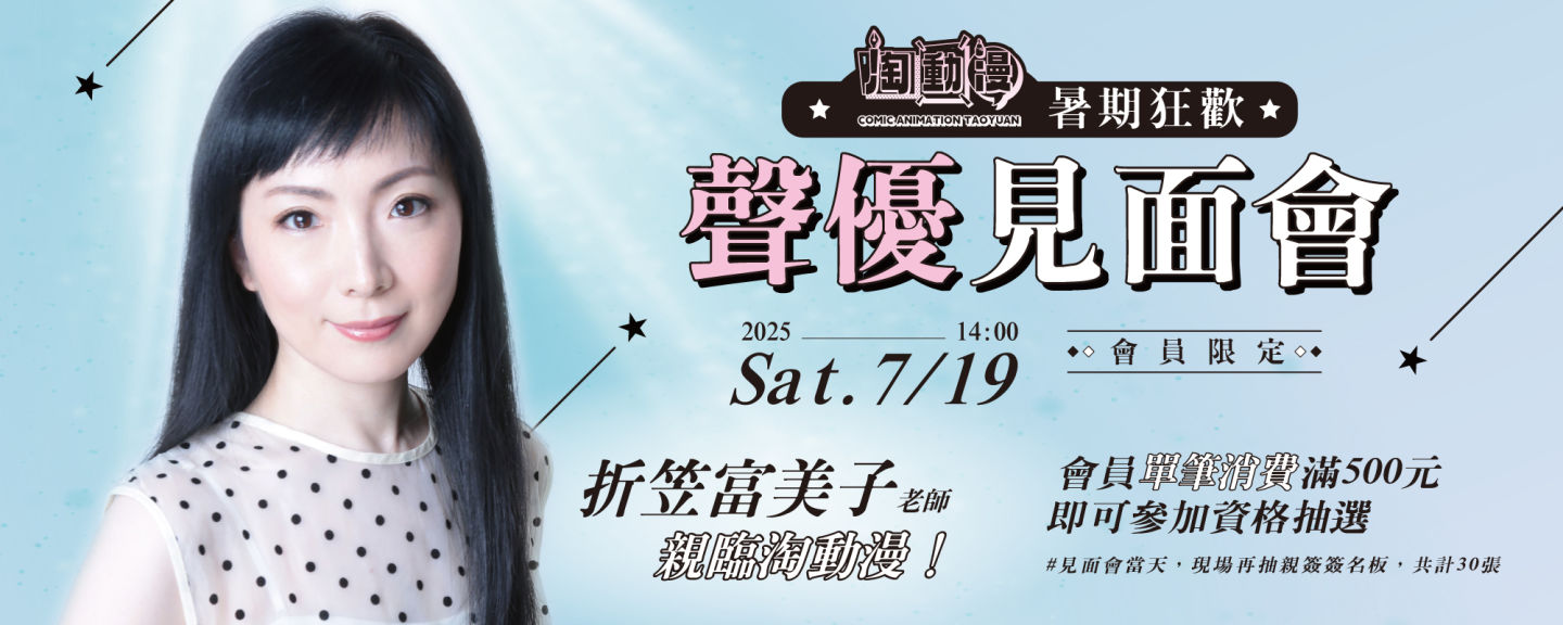 「桃園動漫文創交流基地-淘動漫」,將於7月19日邀請日本知名聲優折笠富美子於基地三樓舉辦粉絲見面會。本次活動為桃園國際動漫大展的系列活動之一,預計邀請50名粉絲入場,其中30名幸運兒有機會獲得折笠富美子的親筆簽名。