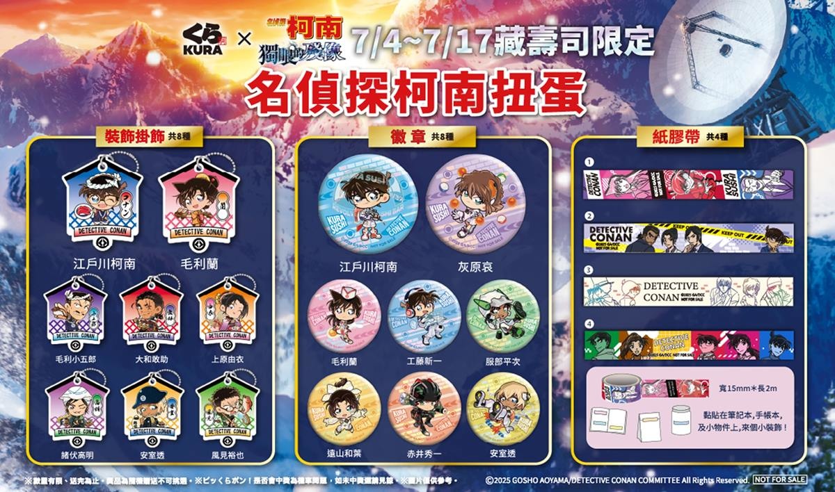 藏壽司今夏攜手《名偵探柯南》揭開盛夏序幕,一同歡慶劇場版電影《名偵探柯南:獨眼的殘像》上映。藏壽司與《名偵探柯南》獨家扭蛋重磅登場,自 7 月 4 日至 7 月 17 日推出 20 款的獨家扭蛋,包含 8 款由經典角色換上未來感服裝造型的「名偵探柯南徽章」、8 款超Q劇場版角色化身壽司老闆的「名偵探柯南裝飾掛飾」以及 4 款重現電影經典名場面、充滿推理調查氛圍的「名偵探柯南紙膠帶」,讓藏友們收好收滿!