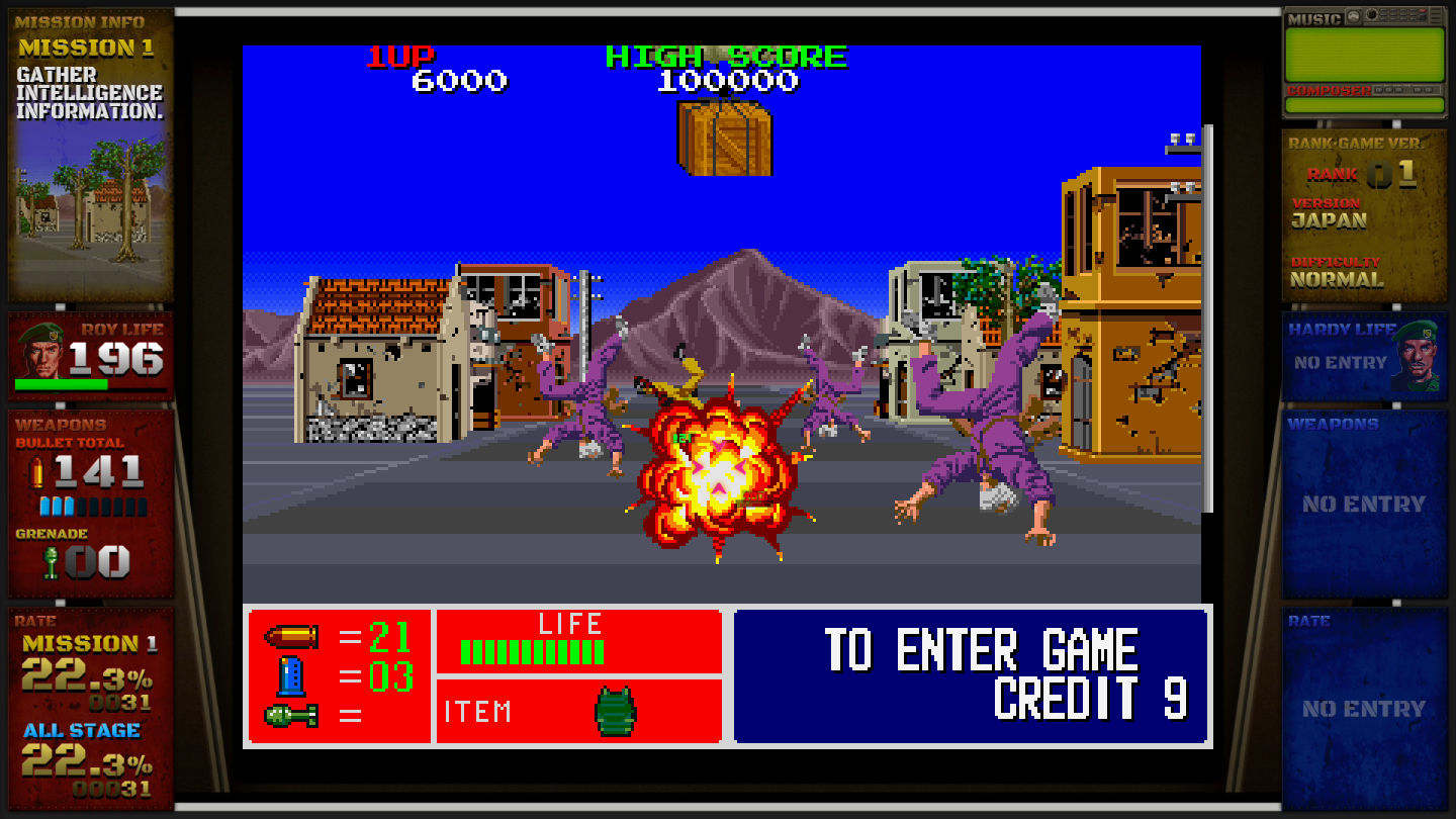 1987 年採用光線槍操作方式的街機射擊遊戲。手持連發機槍與火箭筒,單槍匹馬潛入敵軍基地,營救被囚禁於收容所的人質並帶他們逃出生天吧!作戰代號「狼作戰(Operation Wolf)」的任務絕不容許失敗!