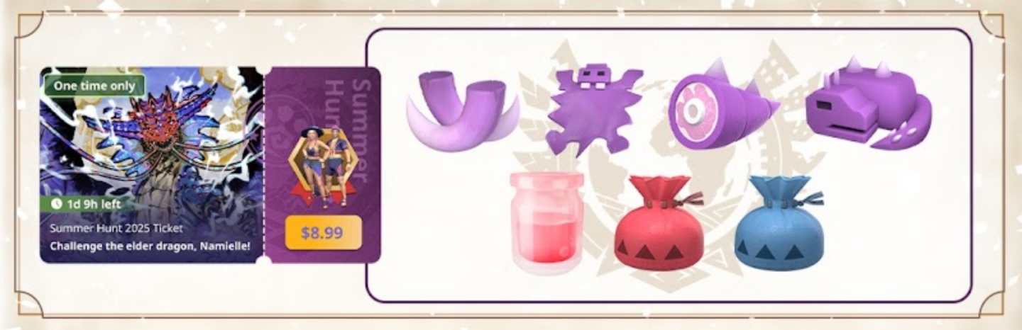 活動票券購買者限定任務「夏日狩獵2025【溟波龍渡海】」將會發布,任務內容包含討伐或擊退溟波龍等條件。完成此任務的主要報酬為限定獵人勳章、限定公會卡背景、武器與防具精鍊素材,以及包含溟波龍的鬚、溟波龍的尾巴等魔物素材。