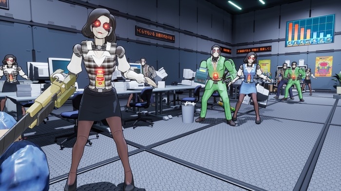 在遊戲中,玩家可以從「荒吐涼子(荒吐リョウコ)」與「南麻布明美(南麻布アケミ)」等兩名女主角中選擇其一使用。這兩名女主角的父親過去都是 MJ 公司的員工,卻因為加班過度過勞而死。為了向隱瞞真相的 MJ 公司復仇,過去曾是 MJ 技術開發者的「葉加瀬博士」的幫助下,向 MJ 社長「富國京平」(富国キョウヘイ)所在的公司大樓最頂層不斷邁進。