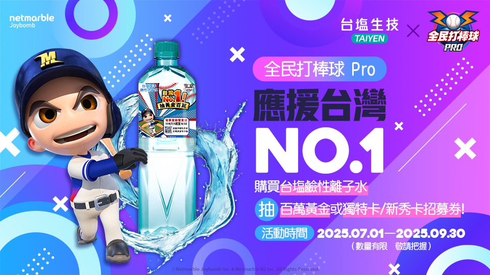 本次合作共計推出 2,000 萬瓶印有《全民打棒球 Pro》人物視覺與 LOGO 的鹼性離子水,玩家購買後憑發票還可以參與抽獎,有機會獲得百萬黃金、《全民打棒球 Pro》最高階球員卡(獨特卡或新秀卡)的招募機會券以及手機等好禮!呼籲玩家踴躍參與,超值獎項不容錯過!